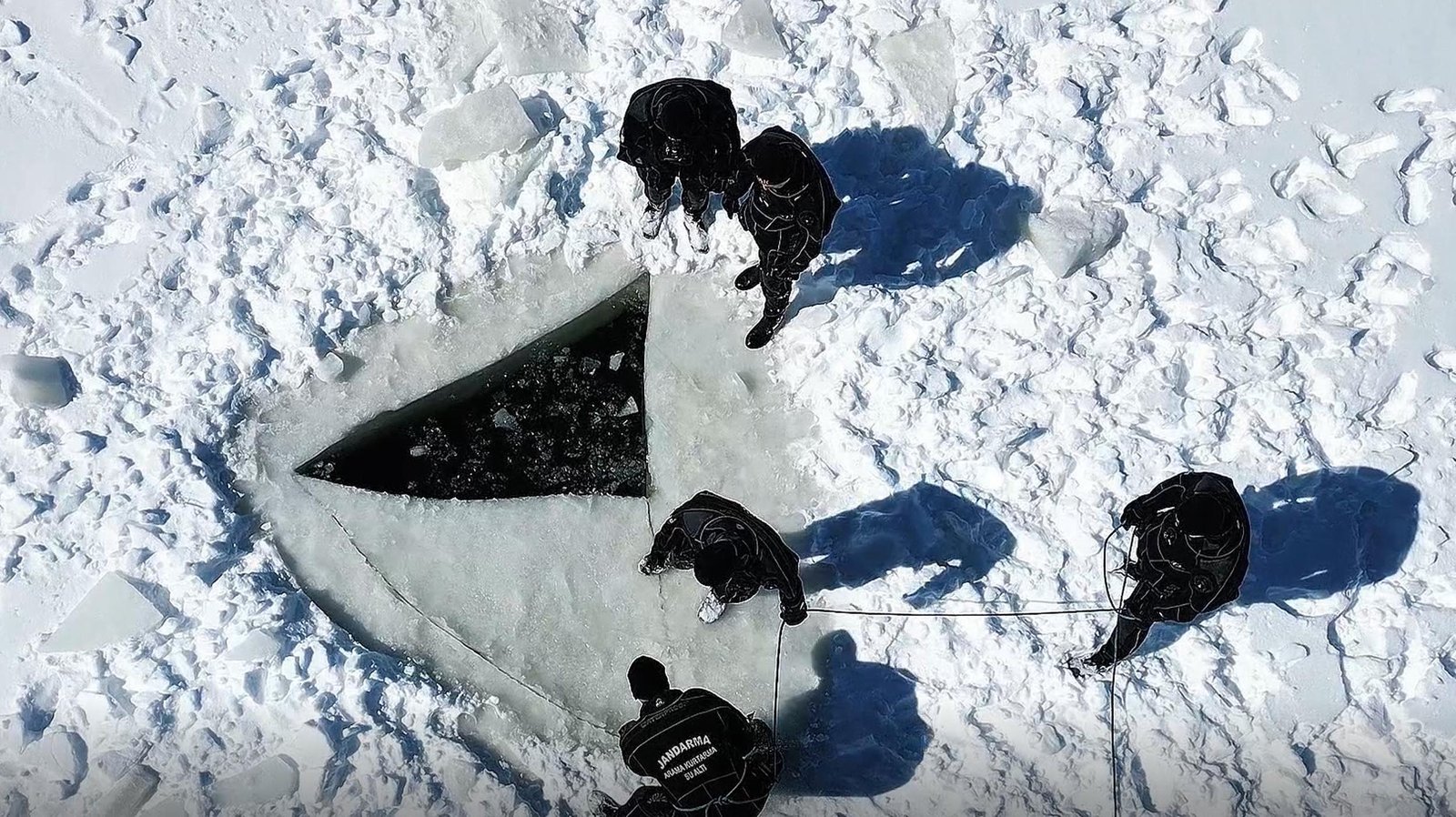 ERZURUM,(DHA)-ERZURUM İl Jandarma Komutanlığı Sualtı Arama Kurtarma (SAK) Timi, 28 santimetre kalınlığındaki buzu testereyle keserek girdikleri gölde Türk bayrağı açtı.