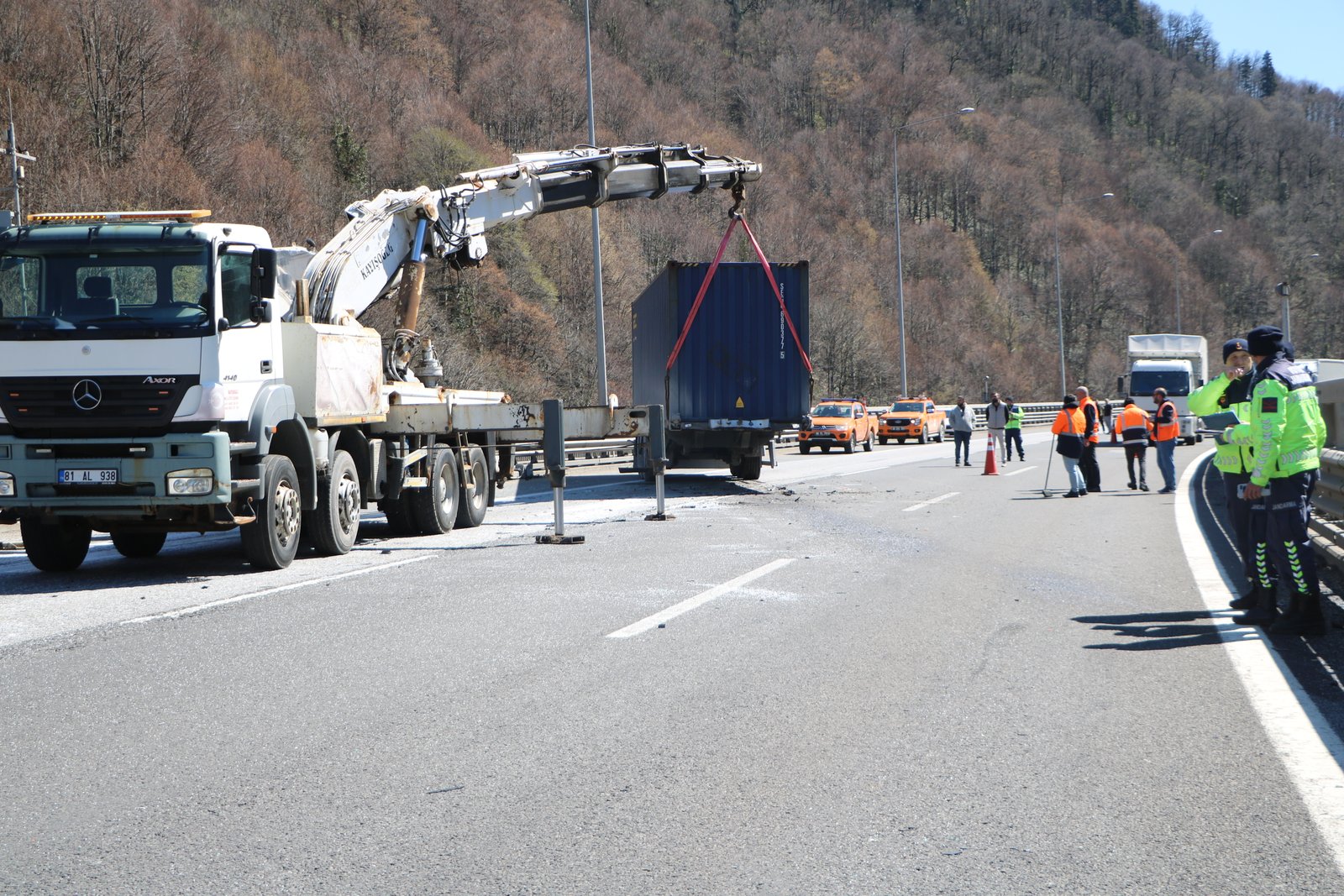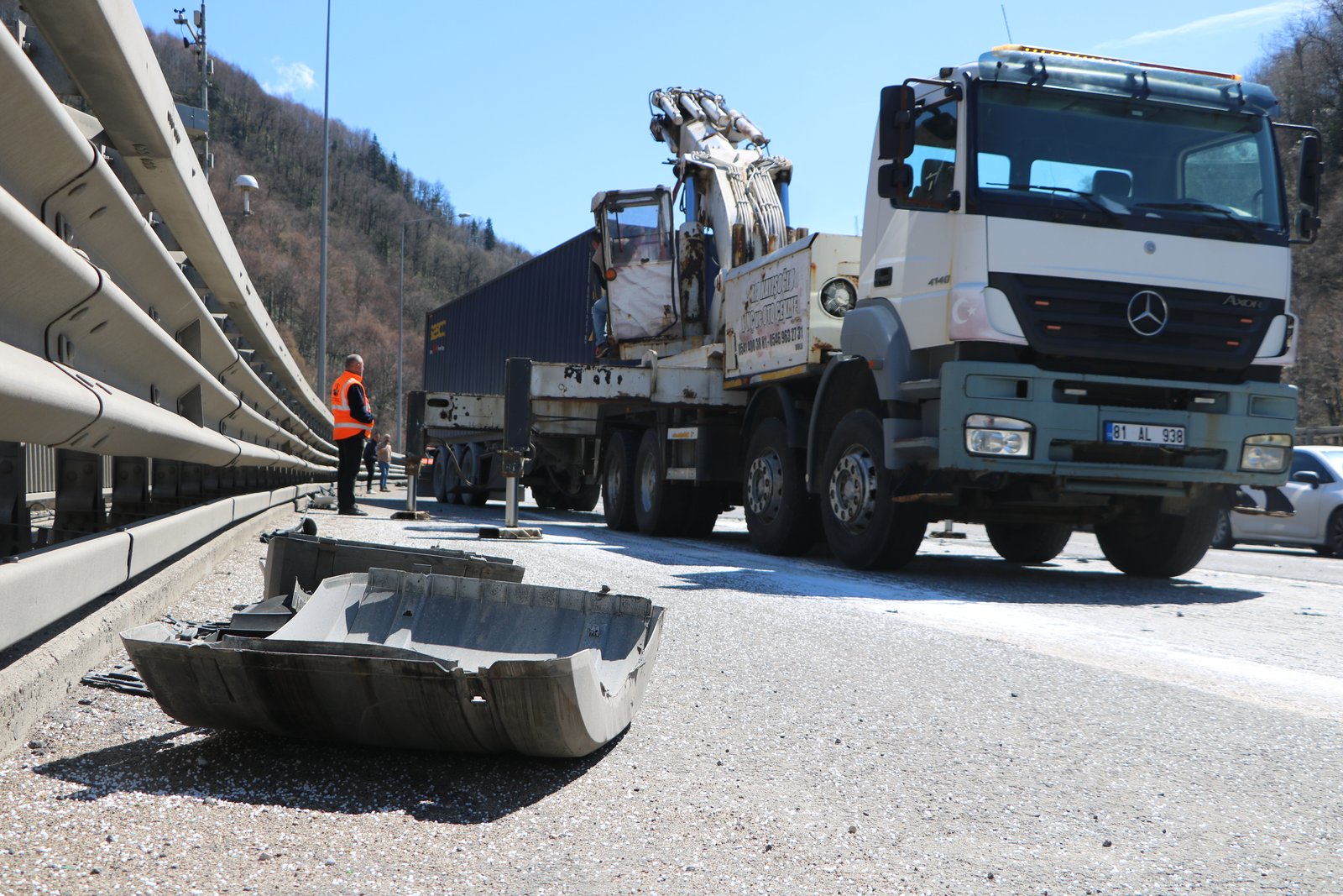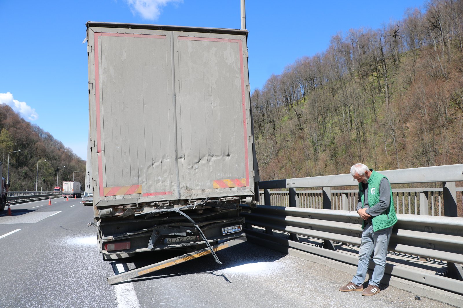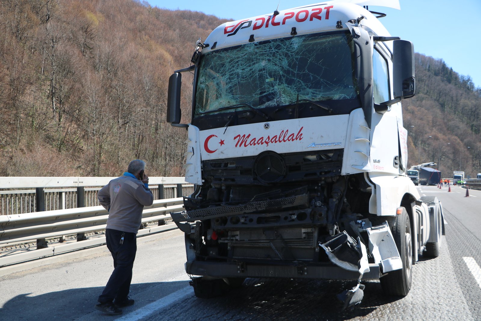 Kaza, saat 10.30 sıralarında Anadolu Otoyolu’nun Bolu Dağı Tüneli çıkışında meydana geldi. İstanbul yönüne giden Oğuz Özarslan yönetimindeki 41 DP 625 plakalı TIR, önünde seyreden Çetin Eyüpoğlu idaresindeki 41 ATZ 625 plakalı kamyona çarptı. Aynı yöne giden 34 FN 0254 ve 34 HLV 943 otomobil ile 41 AAL 824 plakalı hafif ticari araç da kazaya karıştı. Kaza nedeniyle TIR’ın dorsesi koptu. Kazanın ardından olay yerine sağlık ve jandarma ekipleri sevk edildi. Kazada arka arkaya birbirine çarpan iki otomobil ile hafif ticari araçta bulunan 5 kişi, hafif yaralandı. Yaralılar, olay yerine gelen sağlık ekipleri tarafından hastaneye kaldırıldı. Otoyolun İstanbul yönünde uzun araç kuyrukları oluşurken, kazayla ilgili soruşturma başlatıldı. (DHA)