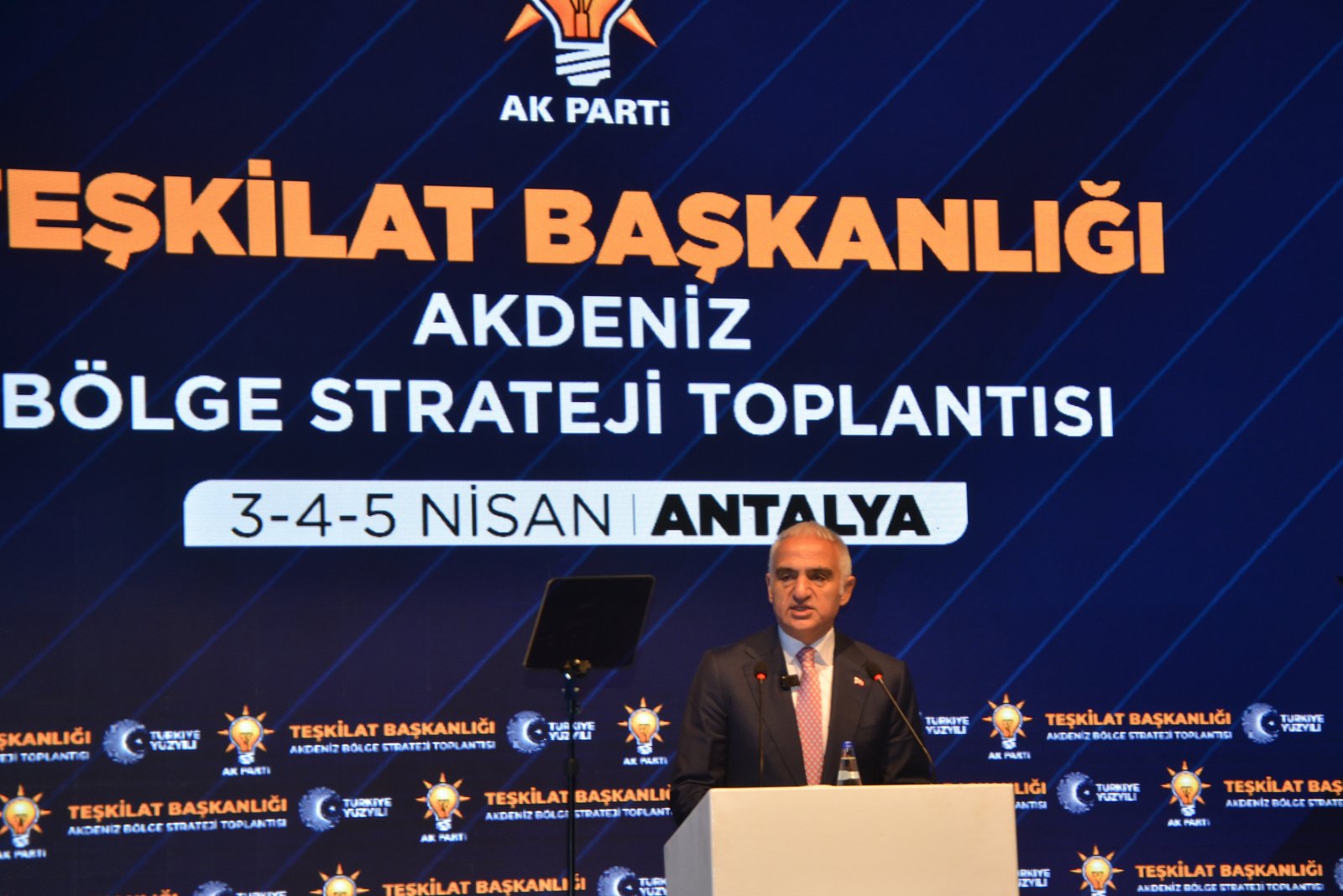 Türkiye’nin geneli olduğu gibi Akdeniz Bölgesi’ni de yoğun şekilde tanıtım faaliyetlerini sürdürdüklerini kaydeden Bakan Ersoy, “Başta Hatay ve Kahramanmaraş olmak üzere depremden etkilenen şehirlerimizde tarihimizin en doğru restorasyon, inşa ve ihya çalışmalarını yürütüyoruz. Tamamen yıkılmış, hasar görmüş tarih yapılarımızı, müzelerimizi, teşhirdeki eserlerimizi ayağa kaldırıyor, tek tek onarıyoruz. Haziran ayı itibarıyla 377 vakıf kültür varlığımızın tamamını restore etmiş ve yeniden ayağa kaldırmış olacağız. Bütün bunların yanında bağlantı altyapıları, tesisleri, 5 yıldız kalitesinde ücretsiz halk plajları, havaalanı kapasite artırım çalışmaları, otoyol düzenleme ve yapım işleriyle bölgeyi halkımız ve yabancı misafirlerimiz için en yüksek hizmet ve konfor seviyesine ulaştırmaya çalışmaktayız” diye konuştu.
