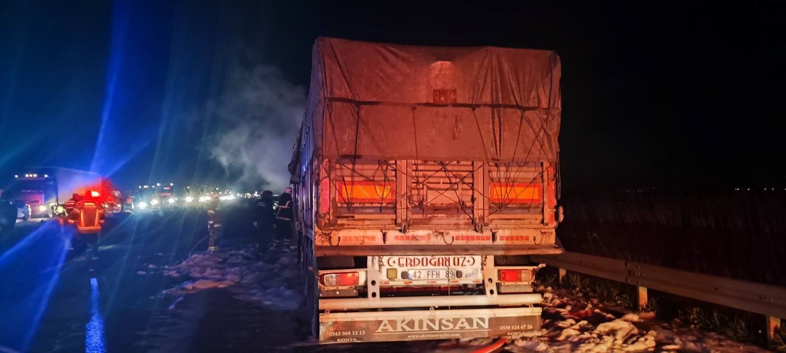 Olay, saat gece yarısı Uluabat Mahallesi’nde meydana geldi. Karacabey’den Bursa istikameti giden İbrahim Ethem D. İdaresindeki 42 FFH 89 plakalı buğday yüklü dorsenin motor kısmında henüz belirlenemeyen nedenle yangın çıktı. Yangını fark eden sürücü TIR emniyet şeridinde durdurdu. İbrahim Ethem D., 112 Acil Çağrı Merkezine haber verirken, alevler kısa sürede tüm TIR’ı sardı. İhbar üzerine olay yerine polis, itfaiye ve sağlık ekipleri sevk edildi. Güvenlik önlemi alan trafik ekipleri, çevredeki vatandaşları uzaklaştırıp yolu ulaşıma kapattı. Yangın ise itfaiye görevlilerinin müdahalesiyle söndürüldü.