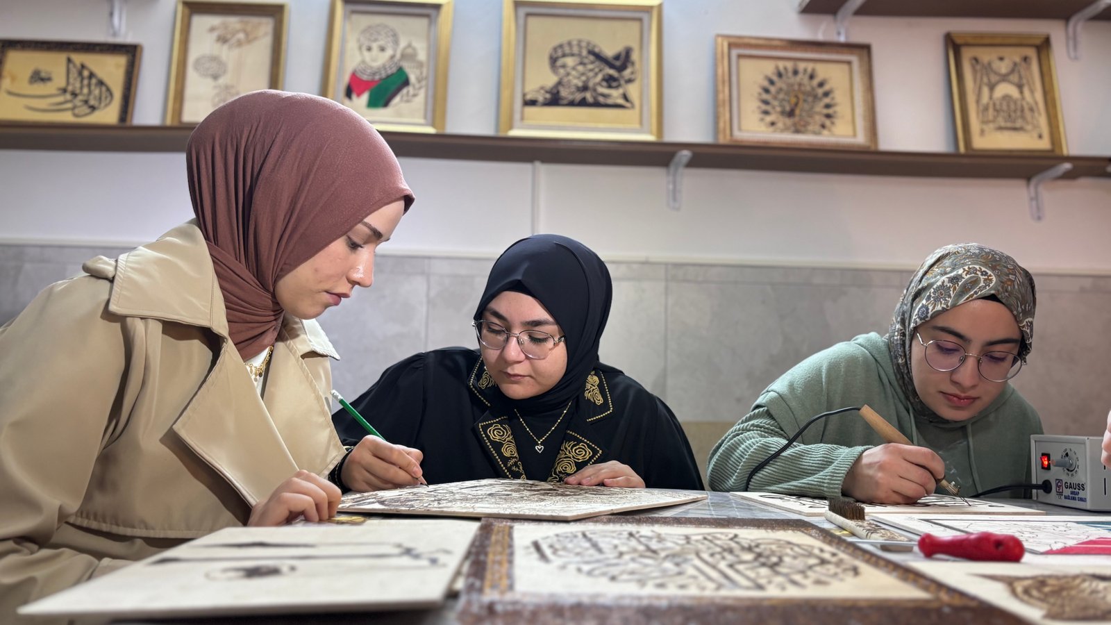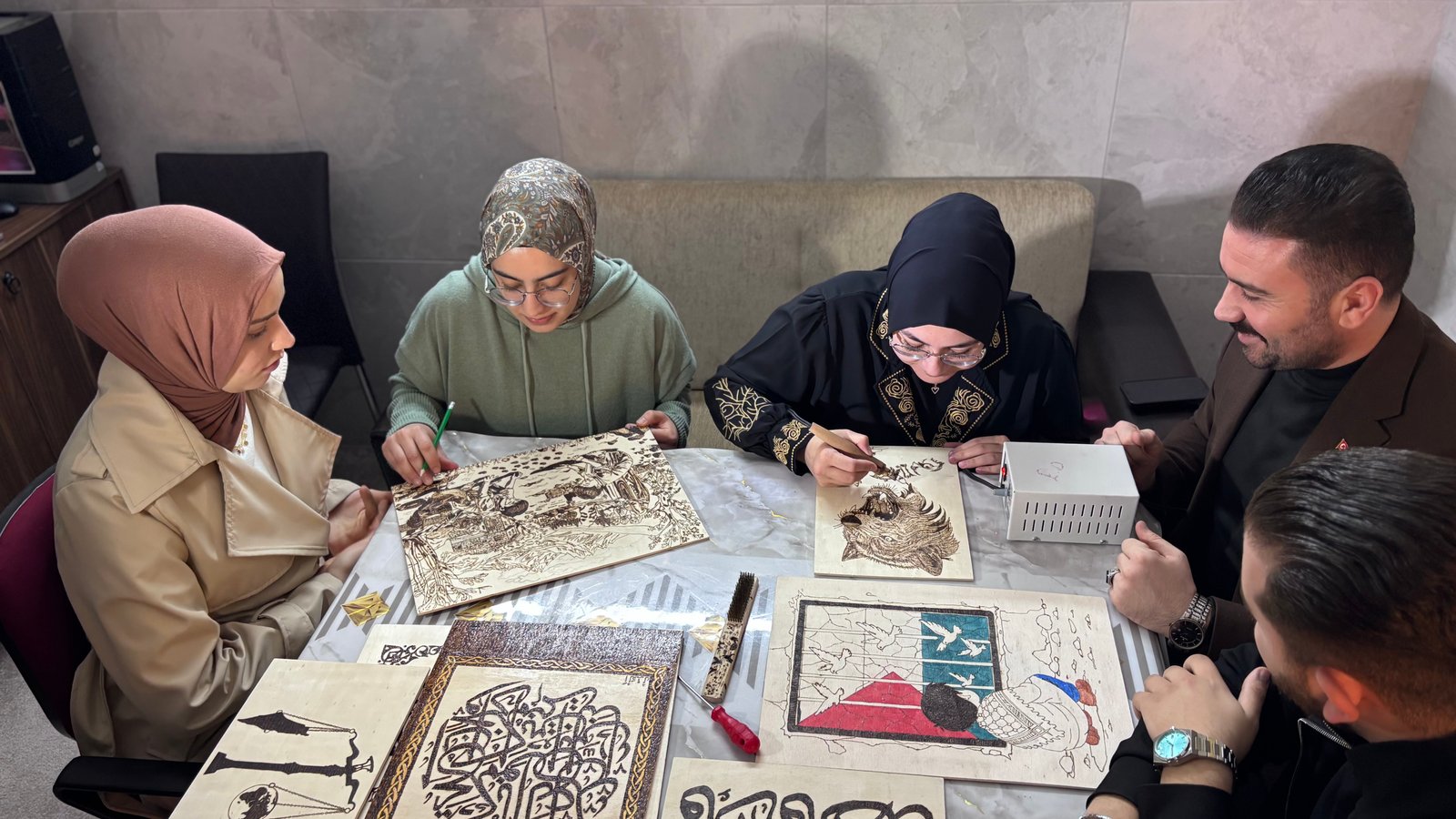 İmam Özer, ahşap yakma sanatının, bir kontrplak üzerine yakma makinesiyle çizilen motifin işlenmesi sonucunda ortaya çıkan sanat olduğunu söyleyerek, “Önce çizeceğimiz motifi belirliyoruz. Motifi kontrplak üzerine çiziyoruz. Çizdiğimiz motifin üzerinden bu sefer yakma makinesiyle geçiyoruz. Çalışmamızı bu şekilde yapıp ortaya bir eser çıkıyor ve akabinde yakılan bu eseri vernikleyip sergiye hazır hale getiriyoruz. Yüzlerce eser ortaya çıkardık. Diyanet İşleri Başkanlığımızın sergileri ve farklı uluslararası sergilerde yer aldık. Eserleri sadece yapıp biriktirmekle kalmıyoruz. Öncelikle gençlerimize burada güzel alışkanlıklar edinmesi için bir sanat öğretmenin gayreti içerisindeyiz. Ahşap yakma sanatını gençlerimize öğretip gençlerimize fayda sağlayacak sergilerde bulunduk. Depremzede öğrencilerimiz de var. Psikolojik olarak da maddi olarak da destek olduk. İlçemizde şehit ve gazi ailelerimizle de sürekli bir ve beraberiz. Gelirini tekrar şehit ve gazi ailelerimize bağışlayacağımız yeni bir sergiyi planlıyoruz. 81 ilimizden belirli motifleri alacağız. Sergi açıp gelirini şehit ve gazi ailelerimize inşallah yine bağışta bulunacağız” dedi. (DHA)