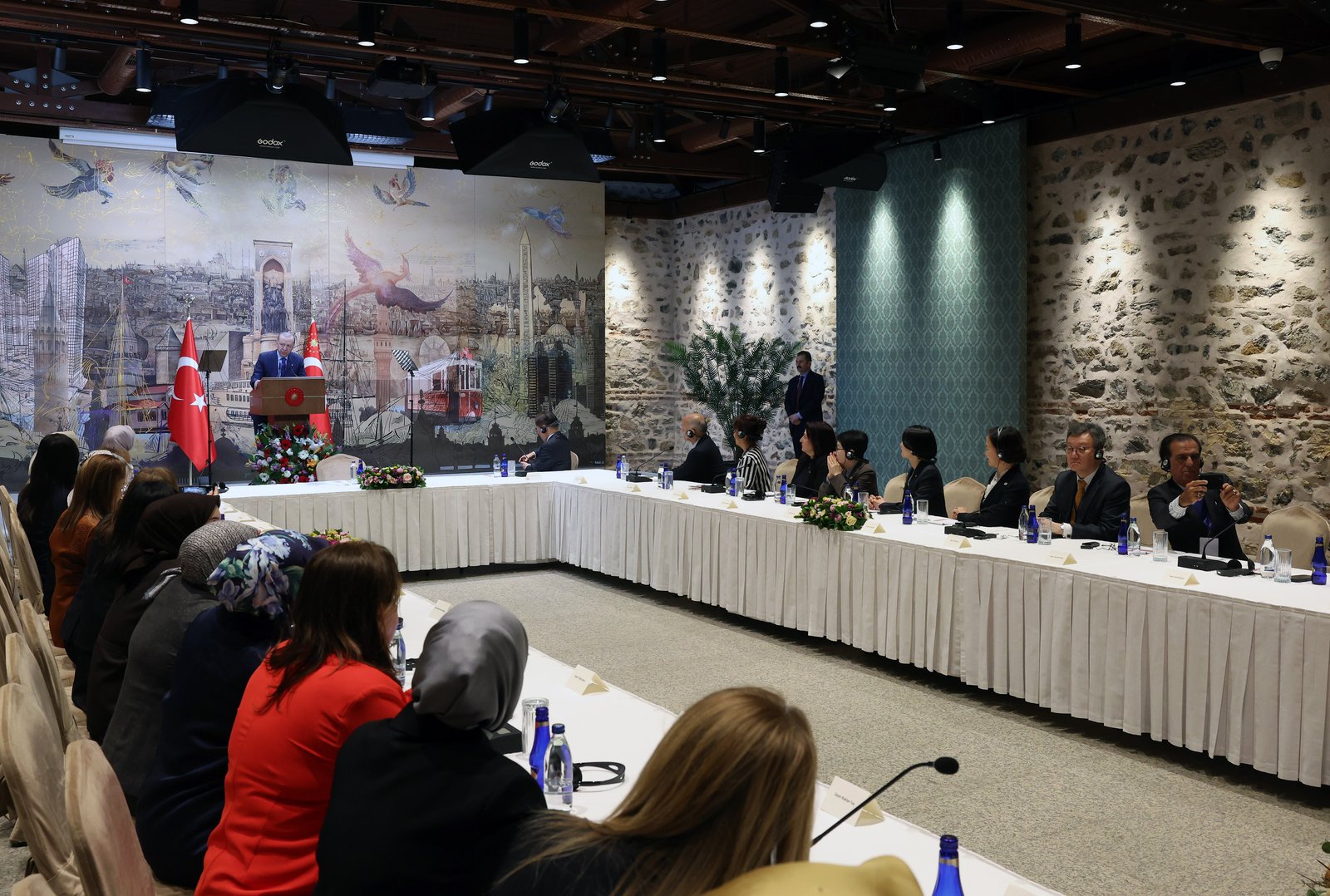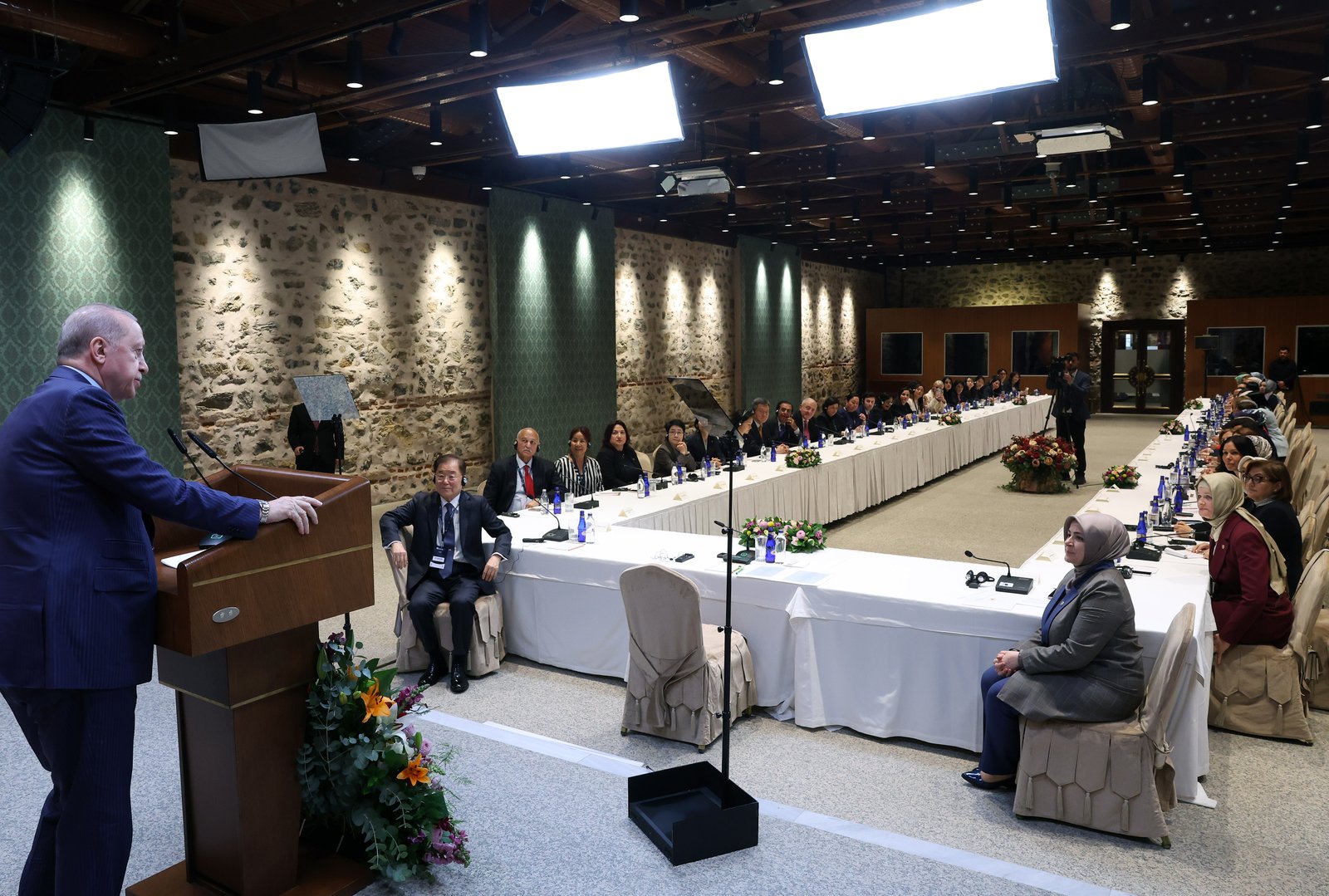 Cumhurbaşkanı Erdoğan, AK Parti Genel Merkez Kadın Kolları Başkanlığı ev sahipliğinde bugün Bahçelievler’de bir otelde düzenlenen ‘Uluslararası Asya Siyasi Partiler Konferansı (ICAPP) Kadın Kolu 9’uncu Toplantısı’ için İstanbul’da bulunan katılımcıları Cumhurbaşkanlığı Dolmabahçe Çalışma Ofisi’nde kabul etti. Kabulde AK Parti Genel Merkez Kadın Kolları Başkanı Tuğba Işık Ercan’ın yanı sıra bugün Asya ülkeleri Kadın Kolları Genel Başkanlığına seçilen AK Parti Konya Milletvekili Meryem Göka ve AK Partili kadın milletvekilleri de hazır bulundu. (DHA)