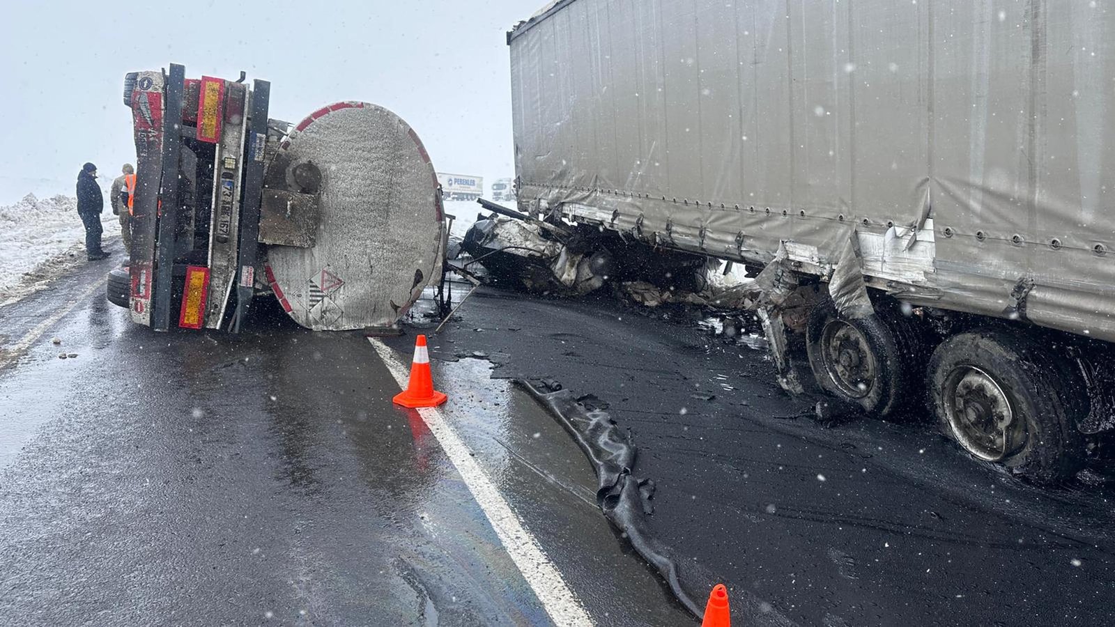Volkan KARABAĞ/KARS, (DHA)- KARS’ta devrilen zift yüklü tankere, kereste yüklü TIR’ın çarptığı kazada sürücüler yaralandı. Tonlarca ziftin yola akması nedeniyle ulaşım bir süre aksadı.