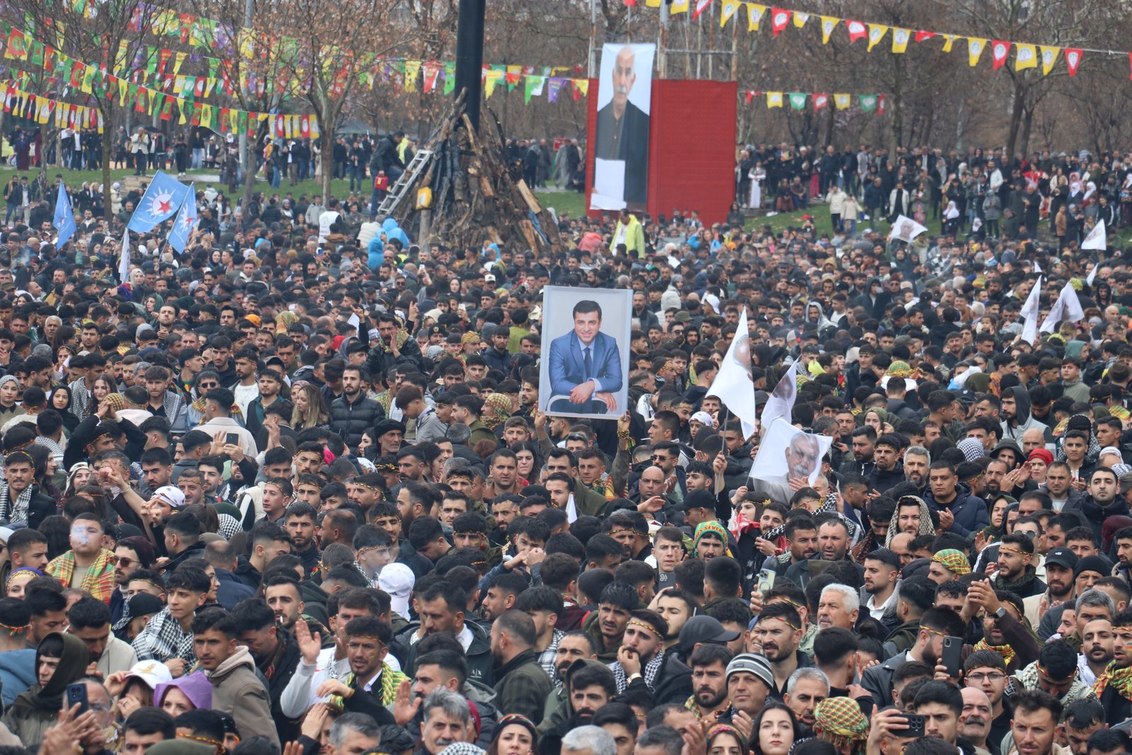 Bazı müzik gruplarının seslendirdiği şarkıların ardından terör örgütü PKK elebaşı Abdullah Öcalan’ın mesajı okundu. Ardından DEM Parti Eş Genel Başkanı Tuncer Bakırhan burada yaptığı konuşmada, “Hepiniz görüyorsunuz Orta Doğu’da her sınır bir yara. Her başkent bir yangın yeridir neredeyse. Bu yangının tam ortasında Kürtler ve Kürt coğrafyası var. Bu tablo içinde Kürtler hem kendi güvenliklerini sağlamaya çalışıyor hem de bölgenin istikrarına katkı sunmaya çalışıyor. Bugün özellikle Ankara’nın önünde tarihi bir fırsat var. Kürt meselesini çözen bir Türkiye bölgede güçlü bir aktör olur. Gelin geleceğimizi kaybetmeyelim. Geleceği kazanmak için demokratik bir zemini hep birlikte büyütelim. Geçmişin yaraları geleceğimizi daha fazla kanatmasın. Bu ülke 100 yıldır defalarca kanadı. Artık bu kanamayı durduralım. Hani hep soruyorlar ya ‘Kürtler ne istiyor’ diye. Kürtler Türkiye’de kimliğinin tanınmasını istiyor. Kürtler ana dilinde eğitim istiyor. Kürtler anayasal güvence istiyor. Kürtler yerel demokrasi istiyor. Kürtler eşit yurttaşlık istiyor. Kürtlerin talebi ayrılık değil, ortaklıktır, inkar değil, tanınmadır, lütuf değil, haktır. Kürtler yönetime ortak olmak istiyor. Kürtler artık devletle münazara değil müzakere yapmak istiyor. Şimdi sıra barış yasalarında, şimdi sıra hukuki güvencede, şimdi sıra devlette ve iktidardadır. Artık sözden yasaya, temenniden güvenceye, vaatten eyleme geçme zamanıdır. Cezaevindekiler artık özgür olmalıdır. Figenler, Selahattinler, Leylalar, Ayşeler ve binlerce tutsak özgür olmalı. Dağdakiler demokratik siyasete katılabilmeli. Sürgündekiler evlerine dönebilmelidir. Demokratik siyasete katılabilmelidir. Halkın iradesini gasbeden kayyımlar artık gitmelidir. Öcalan’ın statüsü ve çalışma koşulları yasal düzenleme ile teminat altına alınmalıdır. Öcalan’ın bu meydanda halkıyla buluşmasının önü artık açılmalıdır” dedi.