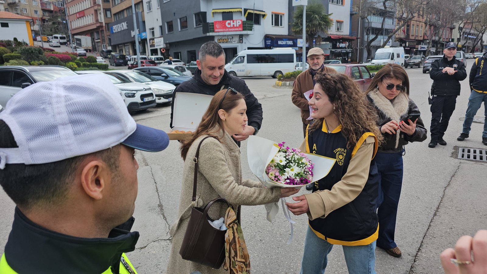 Ali Sencer ARSLAN/ZONGULDAK, (DHA)- ZONGULDAK’ta, Karaelmas Gazeteciler Derneği (KGD) üyesi olan basın mensupları, asayiş uygulaması yapan polislerin, Polis Haftası’nı tatlı ikram ederek kutladı. Gazetecilerin hediye ettiği çiçeği alan memurlardan biri, otomobili kontrol ettiği sırada çiçeği elinde tuttu.