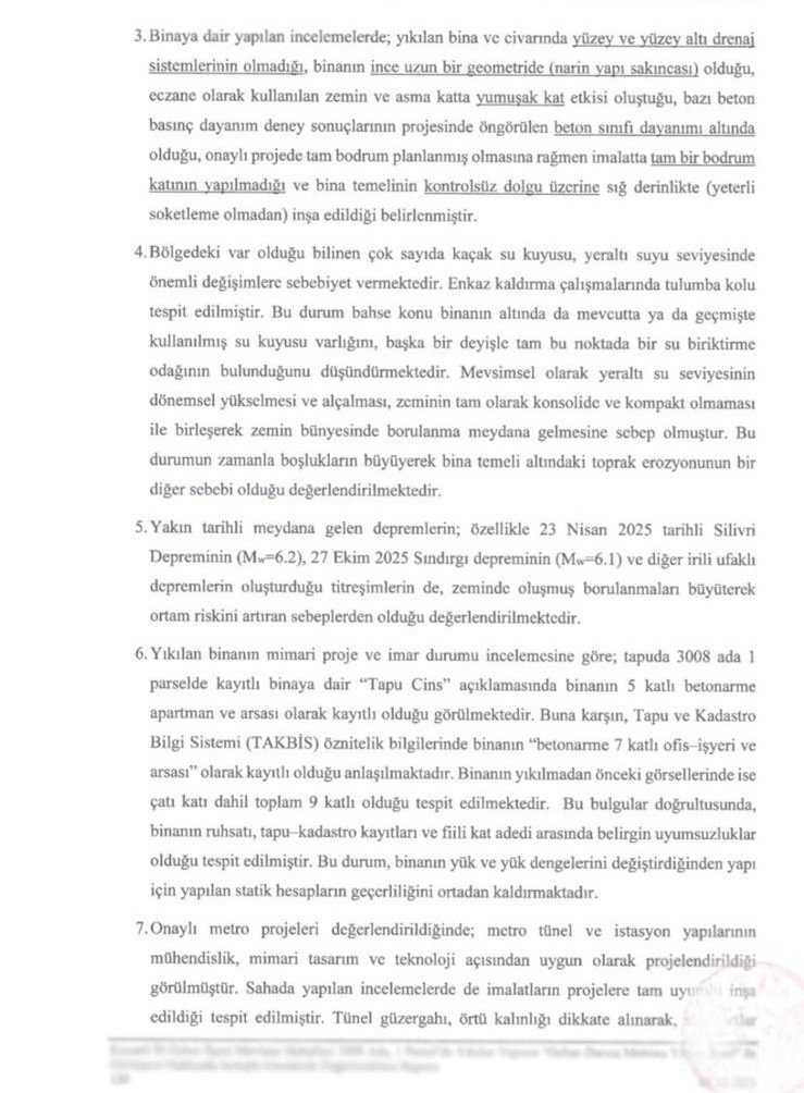 Raporun devamında, metro proje başlangıcından bu yana oluşan tüm zemin hareketinin azami 5 cm olarak ölçüldüğü, bu değerin bina altında oluşan 7 metrelik derin çukura sebep olamayacağına yer verilirken, yapılan teknik değerlendirmeler sonucunda; binanın yıkılmasında, binanın oturduğu zemin ile yüzey ve yüzey altı suyu koşullarının etkili olduğu değerlendirildiği, bina göçmesi ile metro inşaatı arasında direkt bir bağlantı ilişkisi kurulamadığı görüş ve kanaatine varıldığına yer verildi. (DHA)