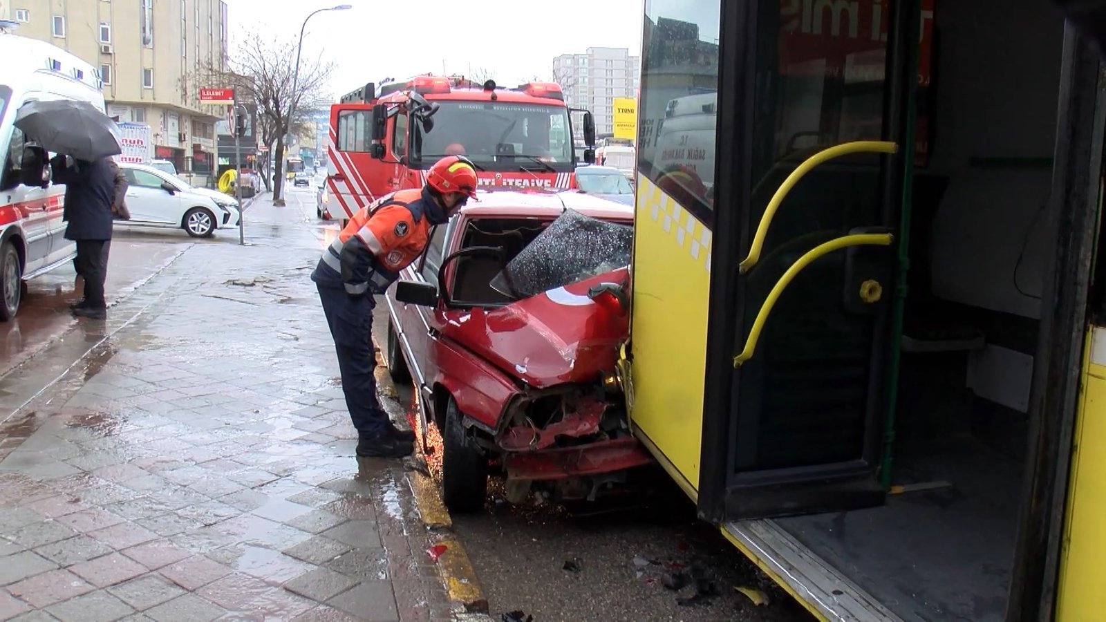 İsa ALMAÇAYIR/İSTANBUL,(DHA)-ÜMRANİYE’de yağışlı havanın etkisiyle kayganlaşan yolda sürücüsünün direksiyon hakimiyetini kaybettiği otomobil, durakta yolcu almak için bekleyen İETT otobüsüne çarptı. Kazada yaralanan otomobil sürücüsü ambulansla hastaneye kaldırıldı.