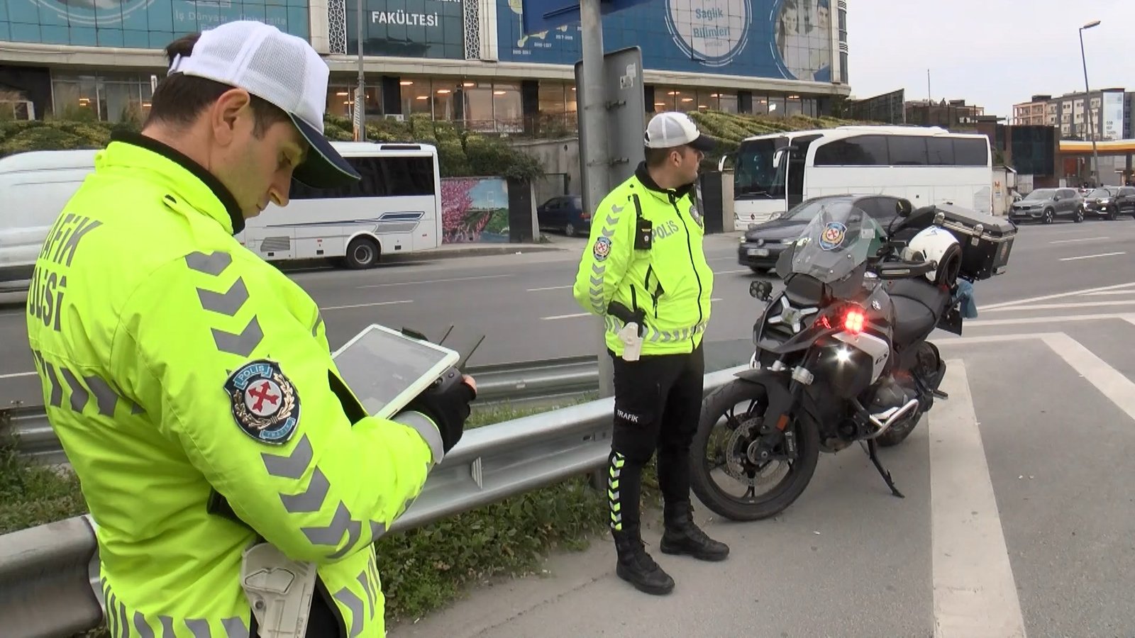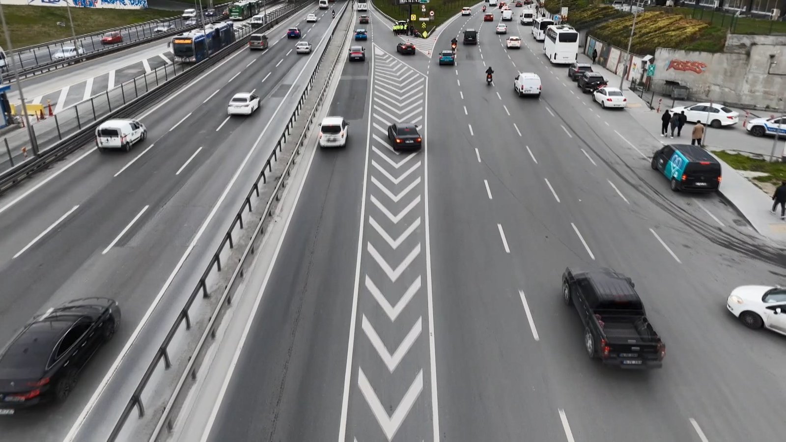 İstanbul Emniyet Müdürlüğü Trafik Denetleme şube müdürlüğü takımları tarafından İstanbul’un farklı ilçelerinde kontrol noktaları kuruldu. Zeytinburnu’nda yapılan kontrollerde, şoförlerin Cevizlibağ D-100 yanyolundan transit yola geçiş sırasında araç trafiğinin düzenlenmesi maksadıyla oluşturulan ofset taralı alanı ihlal ettiği belirlendi. Dron ile havadan yapılan takip sonucu kural ihlali yaptığı tespit edilen araçlar, ileride oluşturulan denetim noktasında takımlarca durduruldu. Kurallara muhalif formda şerit nizamını bozarak ilerlediği belirlenen şoförlerin her birine, Karayolları Trafik Kanunu ‘ofset taralı alan ihlali cezası’ kapsamında 1.246 TL idari para cezası uygulandı.