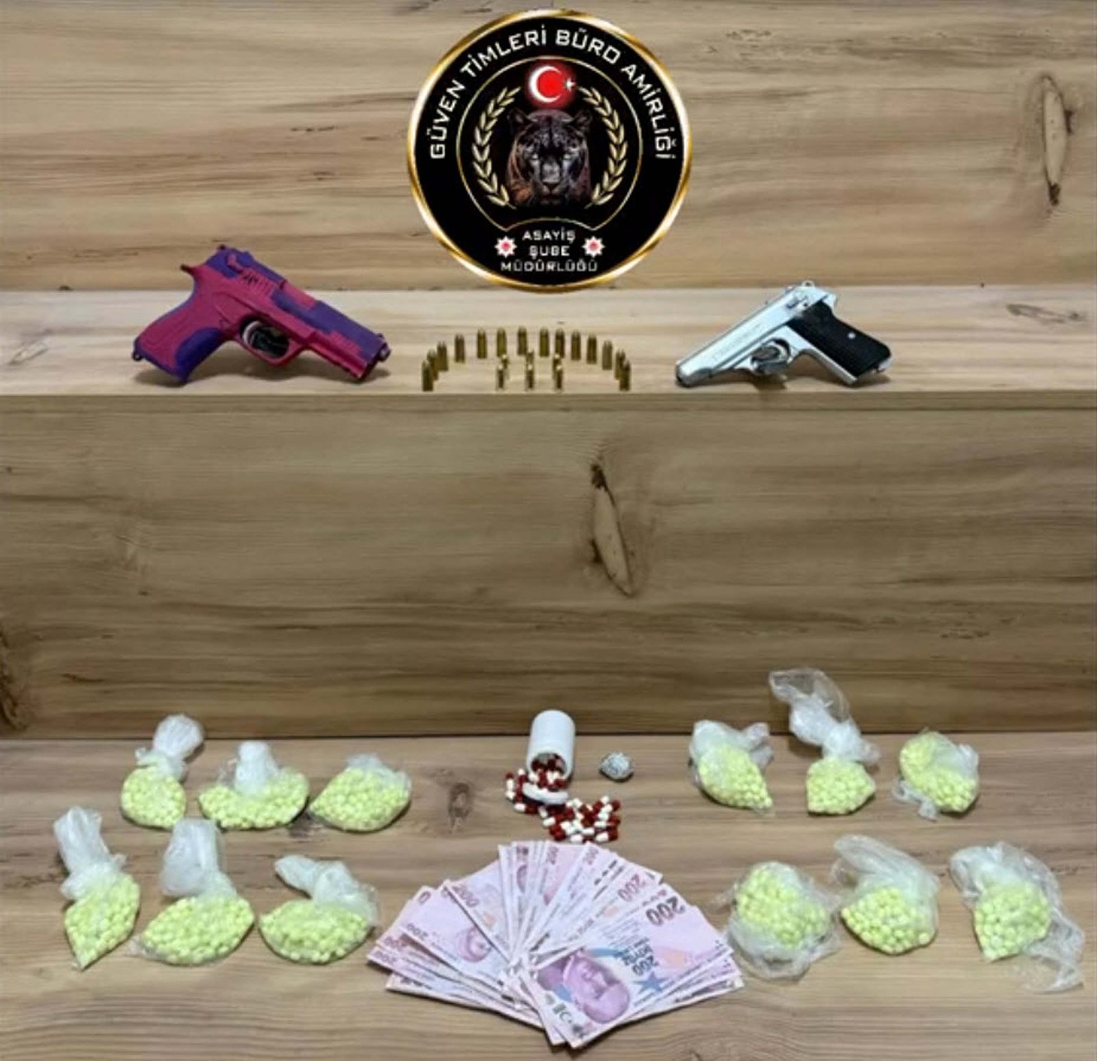 İzmir İl Emniyet Müdürlüğü Asayiş Şube Müdürlüğü ekipleri, silah kaçakçılığı ve uyuşturucu madde satışı suçlarına yönelik çalışma yaptı. Elde edilen bilgiler kapsamında dün Konak ilçesinde R.S.S. isimli şüphelinin adresine yapılan operasyonda, ruhsatsız 2 tabanca, şeffaf poşetler içerisinde 1163 adet ecstasy hap, 41 adet sentetik ecza, 1,36 gram esrar ve 5 bin 55 TL ele geçirildi. Gözaltına alınan şüpheli, Narkotik Suçlarla Mücadele Şube Müdürlüğü’ne teslim edildi. Polisteki işlemlerinin ardından adliyeye sevk edilen R.S.S., bugün çıkarıldığı mahkemece tutuklandı. (DHA)