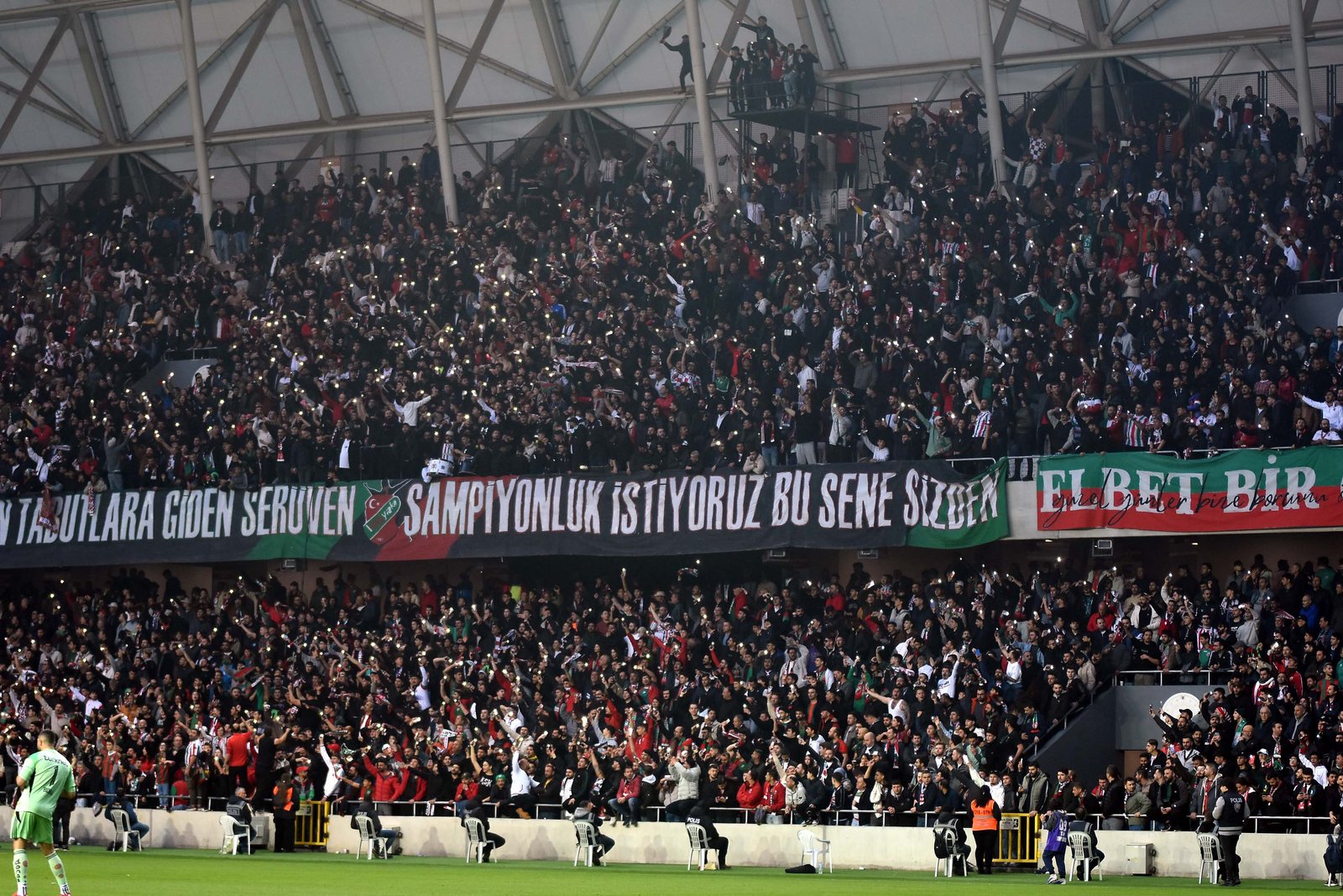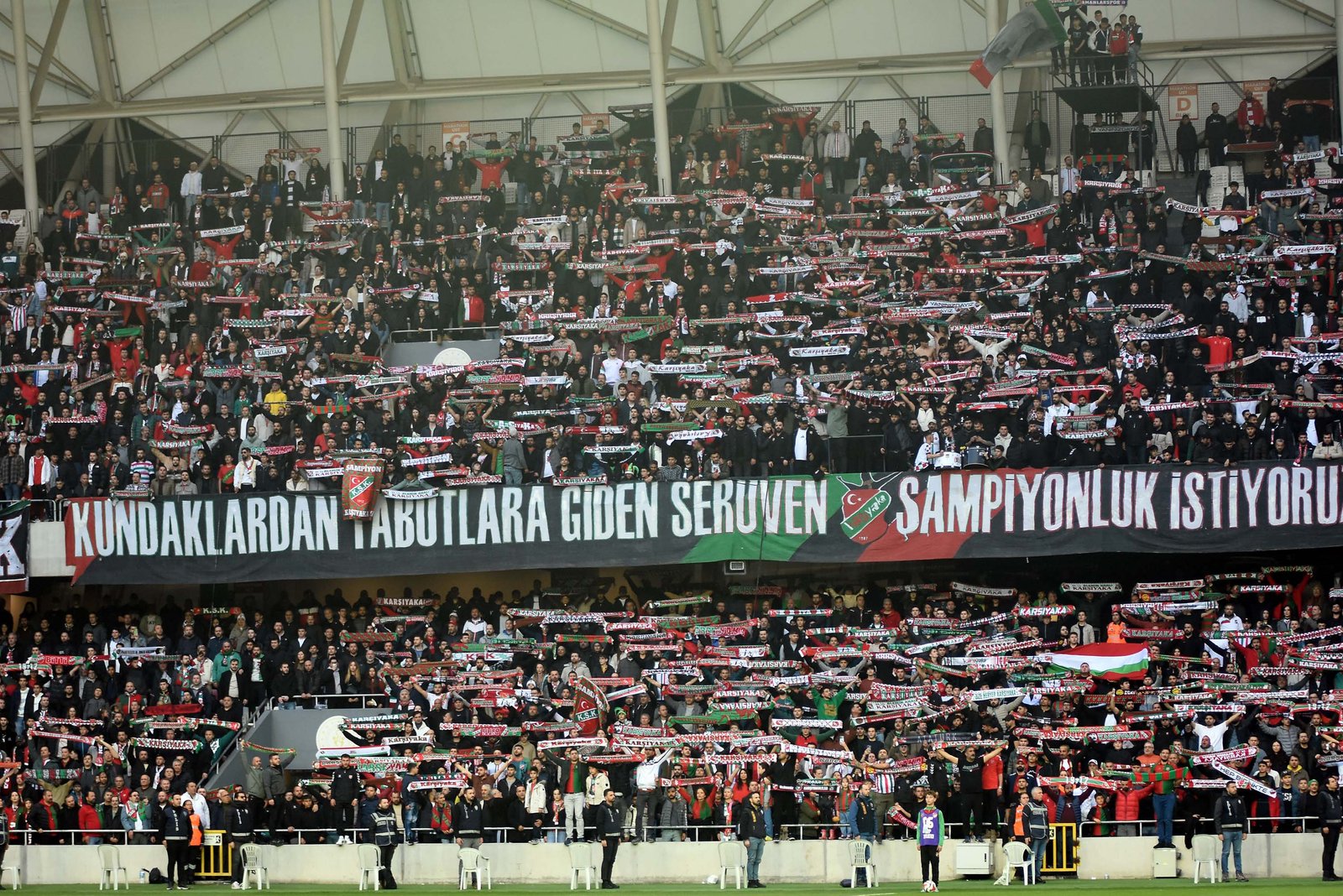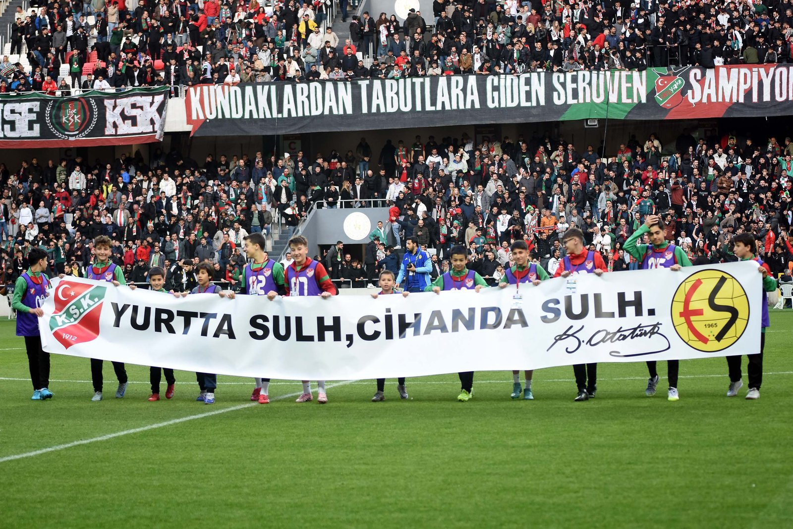 Karşıyaka ve Eskişehirspor taraftarlarının dünkü maçta sergiledikleri karşılıklı dostluk tablosu alkış aldı. Taraftarlar, Alsancak Stadı’nda karşılaşmadan önce Atatürk’ün, “Yurtta sulh, cihanda sulh” sözlerinin yazılı olduğu ve iki kulübün logosunu taşıyan pankartla sahada barışı sembolize eden beyaz güvercinler uçurdu. Karşıyaka taraftarları bu esnada, “Savaşlar olmasın, çocuklar ölmesin” diye tezahürat yaparak savaşlara tepki gösterip barış mesajları verdi. Maçın ilk yarısında Eskişehirspor taraftarlarının bir kısmının dışarına kalmasına iki takım tribünleri birlikte tepki gösterdi. Karşıyakalılar, ilk yarıda şiddetli yağış nedeniyle konuk taraftarların kendi tribünlerine alınmasını da istedi. Eskişehirliler dışarıda kalan arkadaşları nedeniyle tepki gösterip ilk yarı bitmeden misafir tribünü boşalttı. İki takımın teknik direktörleri Burhanettin Basatemür ve Hakan Şapçı da maç öncesi uzun süre sohbet etti.