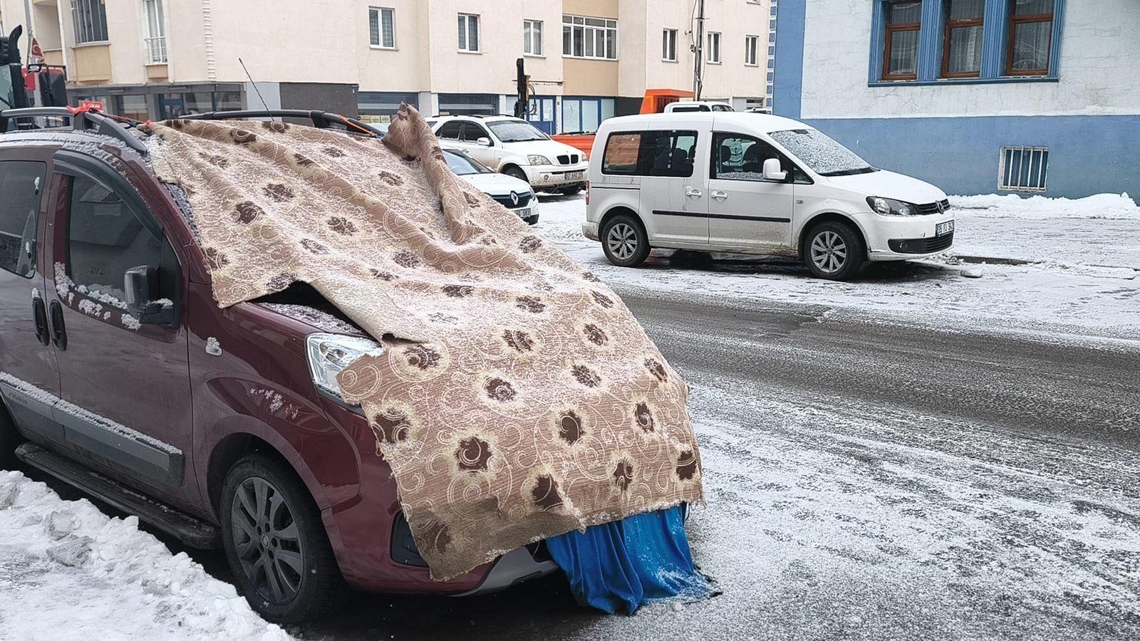 Volkan KARABAĞ/KARS, (DHA)- KARS’ta, dün akşam saatlerinde kar yağışı tesirli oldu. Birtakım şoförler araçlarını battaniye örterek soğuktan muhafazaya çalıştı.