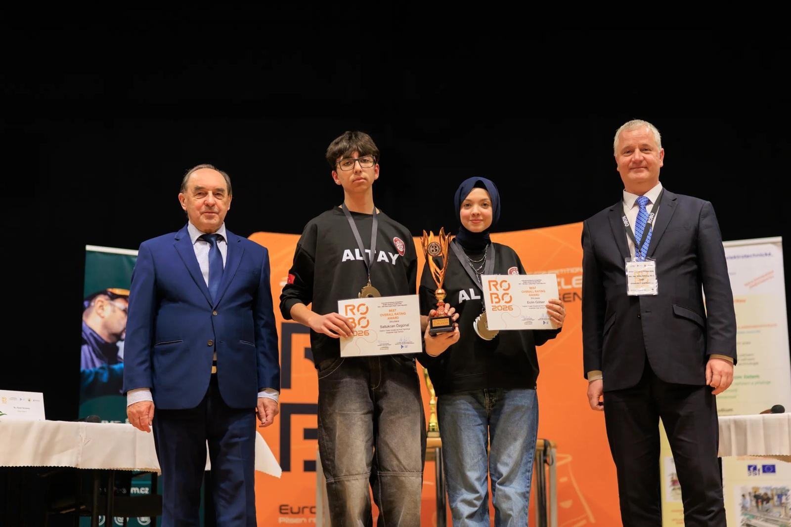 Yiğithan HÜYÜK/BURSA, (DHA)- BURSA Yıldırım Ticaret Mesleki ve Teknik Anadolu Lisesi 11’inci sınıf öğrencileri Saltukcan Özgünal ve Ecrin Gülser, öğretmenleriyle birlikte geliştirdikleri ‘Altay’ isimli robotla, Çekya’da düzenlenen, 8 ülkeden 28 takım 56 öğrencinin katıldığı ‘RoboPlzen 2026’da ‘Otonom Araç Kategorisi’nde dünya 2’ncisi oldu.