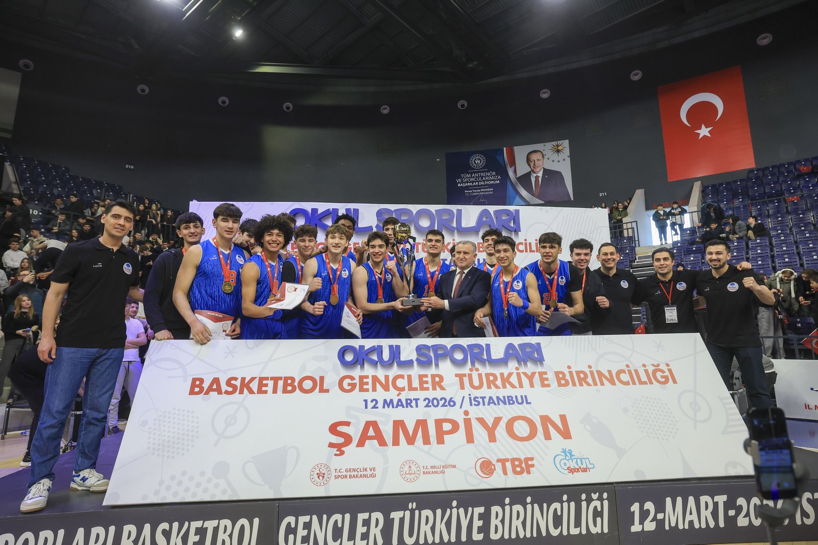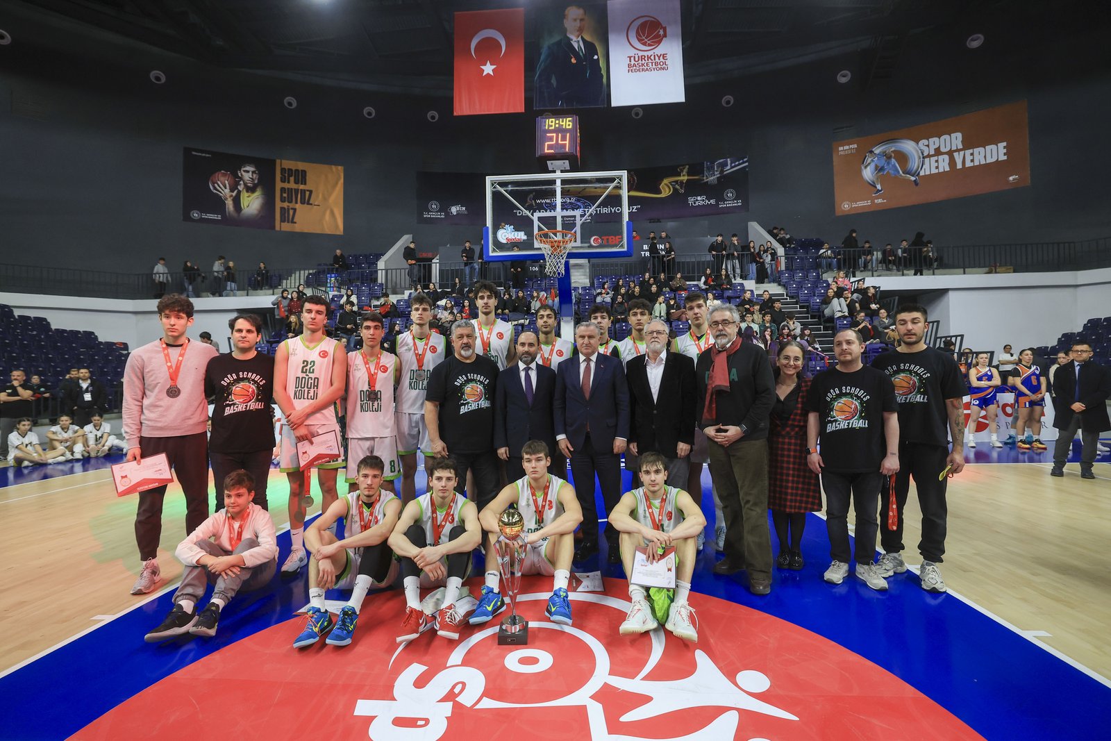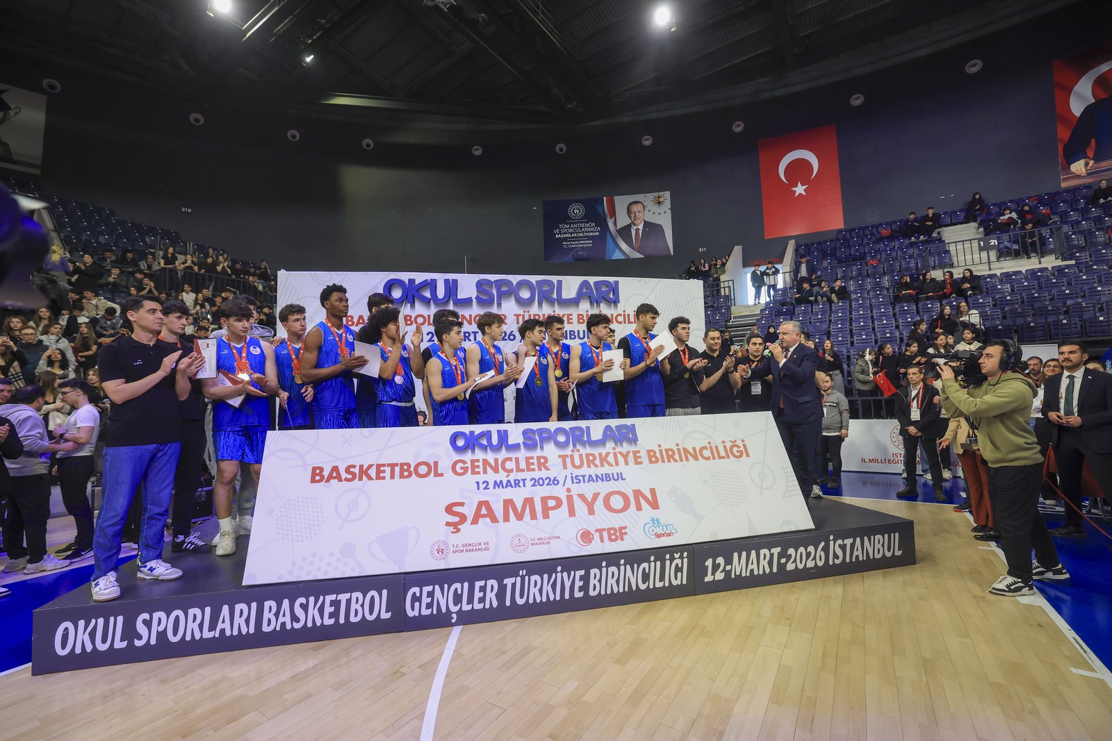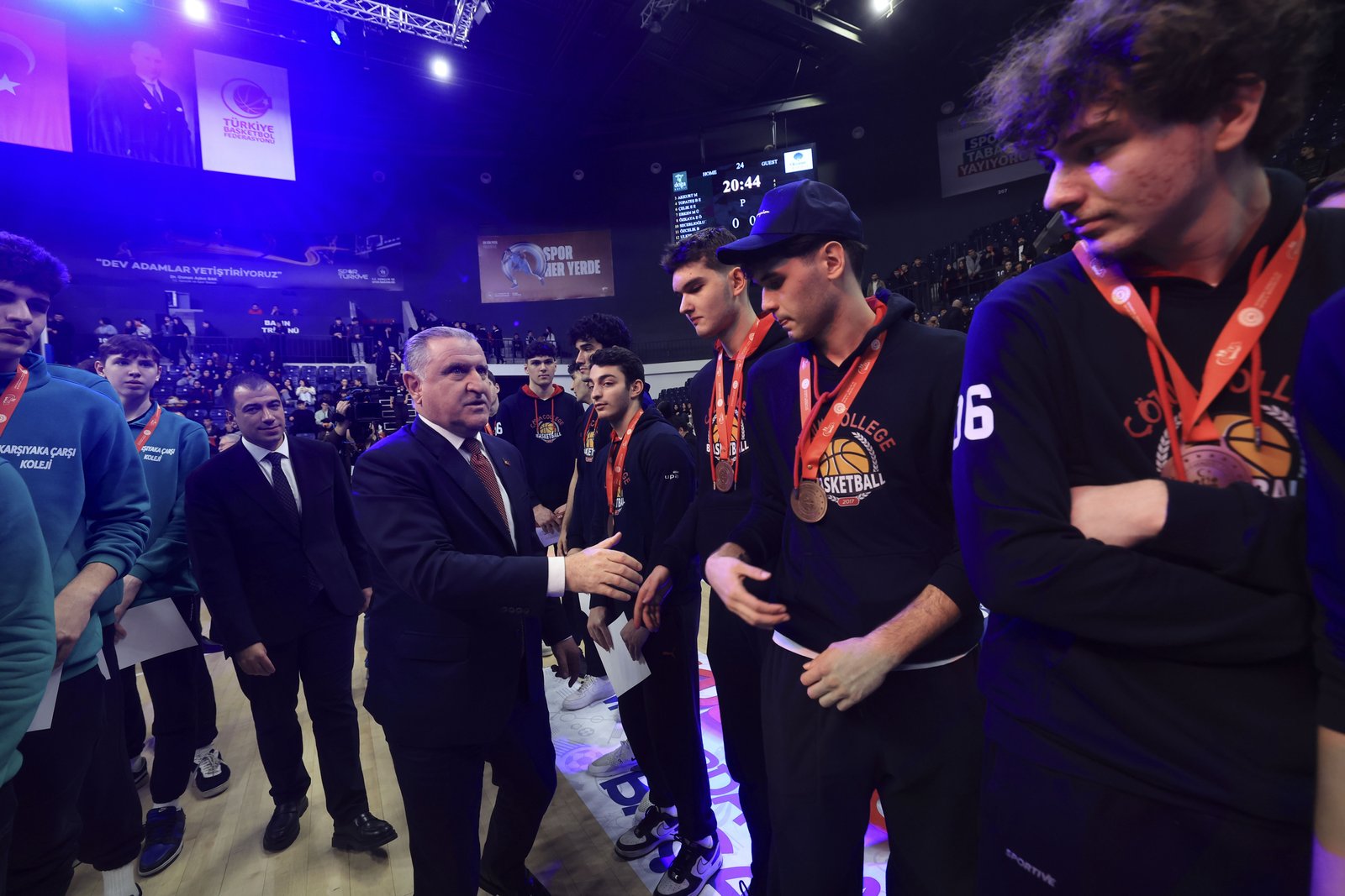 Ödül merasimi öncesinde konuşan Gençlik ve Spor Bakanı Dr. Osman Aşkın Bak, finalde gayret eden atletleri tebrik ederek, “Bütün çocuklarımızı tebrik ediyoruz. Okul Sporları Daire Başkanlığımız tarafından organize edilen hoş bir final karşılaşması izledik. Süper bir atmosferde oynanan GSB Okul Sporları Basketbol Gençler Türkiye Finallerinin coşkusuna şahit olduk. Onlar geleceğin 12 Dev Adam’ı. Onları alkışlıyoruz. Onlara takviye veren ailelerine, öğretmenlerine ve okullarına çok teşekkür ediyorum. Burası nitekim olağanüstü bir final maçına konut sahipliği yaptı. Süper bir salonda, mükemmel bir seyirci ve harika oyuncularla Türk sporu doruğa yanlışsız ilerliyor. Bunu bugün bu salonda gördük. Yeni 12 Dev Adam’lar burada, onları alkışlayalım. Her birinizle gurur duyuyor, gönülden muvaffakiyetler diliyorum. Her vakit yanındayız” dedi.