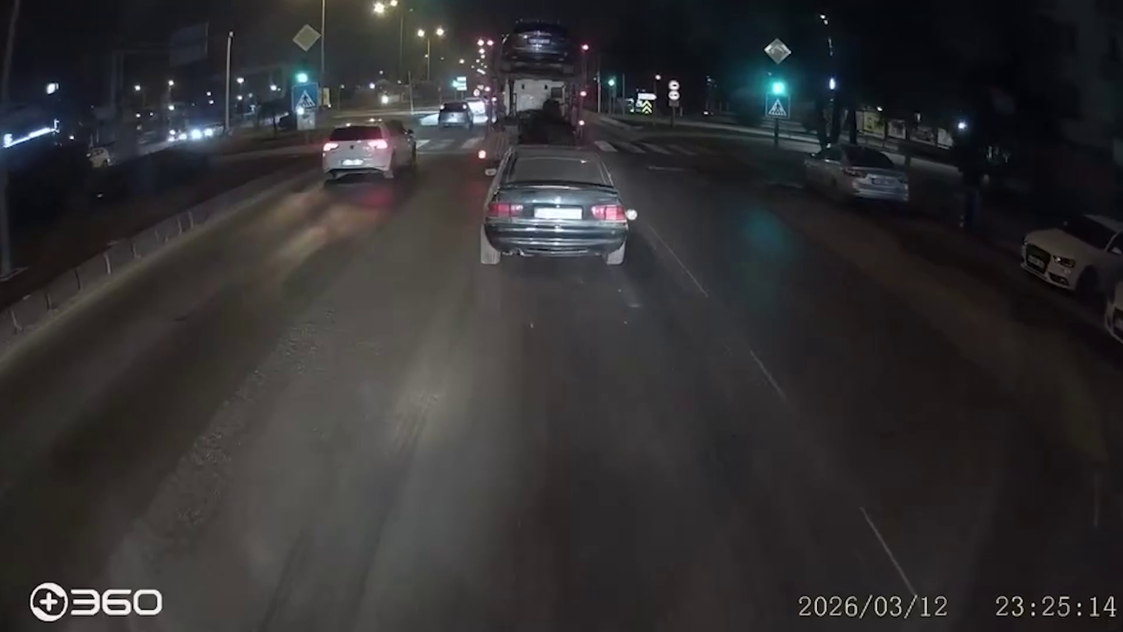 Zübeyde ÖZMEN/BOLU, (DHA)-BOLU’da D-100 kara yolunda trafik ışıklarında duran bir oto kurtarıcı, hareket ettiği sırada üzerindeki arabalardan biri yola düştü. O anlar, bir TIR’ın araç içi kamerası tarafından görüntülendi.