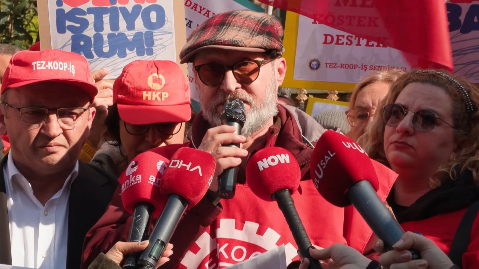 Türk iş İstanbul 1.Bölge Temsilcisi Halil Faki Erdal, “Milli Eğitim Bakanlığı’nın bir önce yaptığı yanlıştan dönmesini bizler Türk-İş sınıfı olarak buradan talep ediyoruz. Eğer bu taleplerimiz yerine gelmezse Tez-Koop-İş olarak da Türk-İş olarak da grevin gittiği yere kadar, kazanana kadar direnerek kazanacağız” dedi. (DHA)