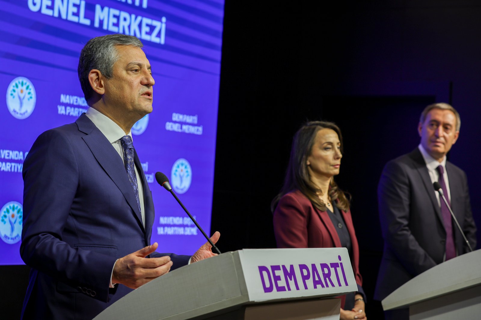 CHP Genel Başkanı Özgür Özel, DEM Parti Eş Genel Başkanları Tuncer Bakırhan ve Tülay Hatimoğulları’nı ziyaret etti. DEM Parti Genel Merkezi’nde basına kapalı gerçekleşen görüşme 1 saat 40 dakika sürdü. Görüşmenin ardından açıklamalarda bulunan Özel, görüşmede, dış ve iç politikada yaşananları, CHP’li belediye başkanlarına yönelik operasyonları ele aldıklarını söyledi. Özel, “Türkiye ekonomisi kötü yönetildiği için, son derece kırılgan olduğu için ve İran savaşı gibi bütün dünya ekonomileri üzerinde etki yapacak bir konuda gerekli koruma mekanizmaları olmadığı ya da zaten örneğin geçmişte bizim ’19 Mart darbesi’ olarak ifade ettiğimiz dönemde o kadar çok rezerv yakıldı ve yerine konması için o kadar çok bedel ödendi ki bu bedeller vatandaşın sırtına yoksulluk, işsizlik, hayat pahalılığı olarak yansıdığı için yeni bir şok, arada bir tampon olmaksızın bütün dünya ülkeleri kendi vatandaşlarını korurken, Türkiye’de bir tek vatandaşın sırtına biniyor. Şunu bir kez teyit edelim. Savaşın kazananı olmaz. Kaybedeni kadınlar ve çocuklardır” diye konuştu.