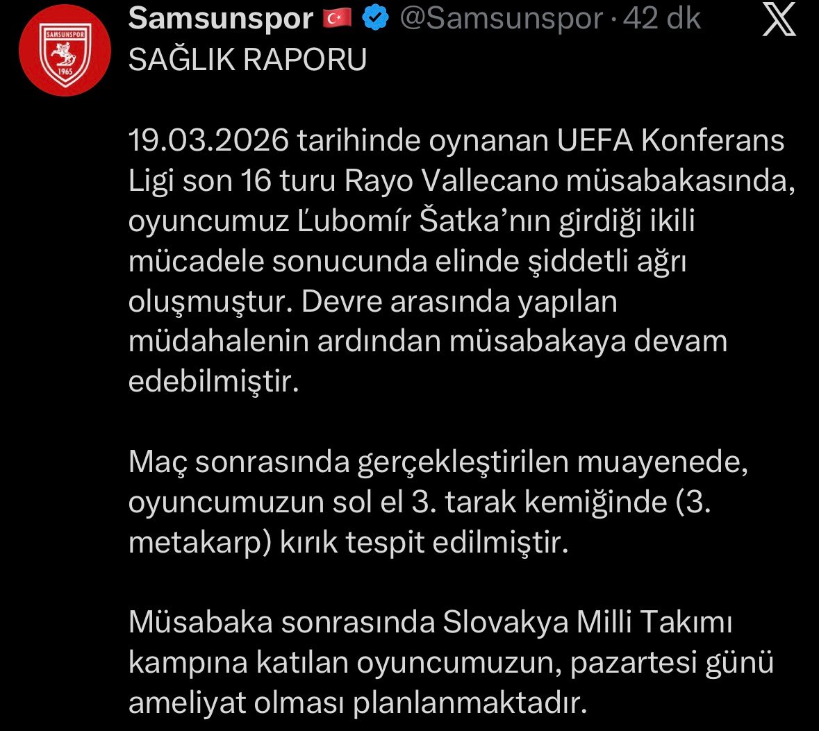 Berkay YILDIZ / SAMSUN, (DHA)- SAMSUNSPOR’UN, 19 Mart 2026 tarihinde UEFA Konferans Ligi Son 16 Turu’nda deplasmanda İspanya temsilcisi Rayo Vallecano ile oynadığı karşılaşmada sakatlanan Slovak oyuncu Lubomir Satka’nın sol elinde kırık tespit edildi.