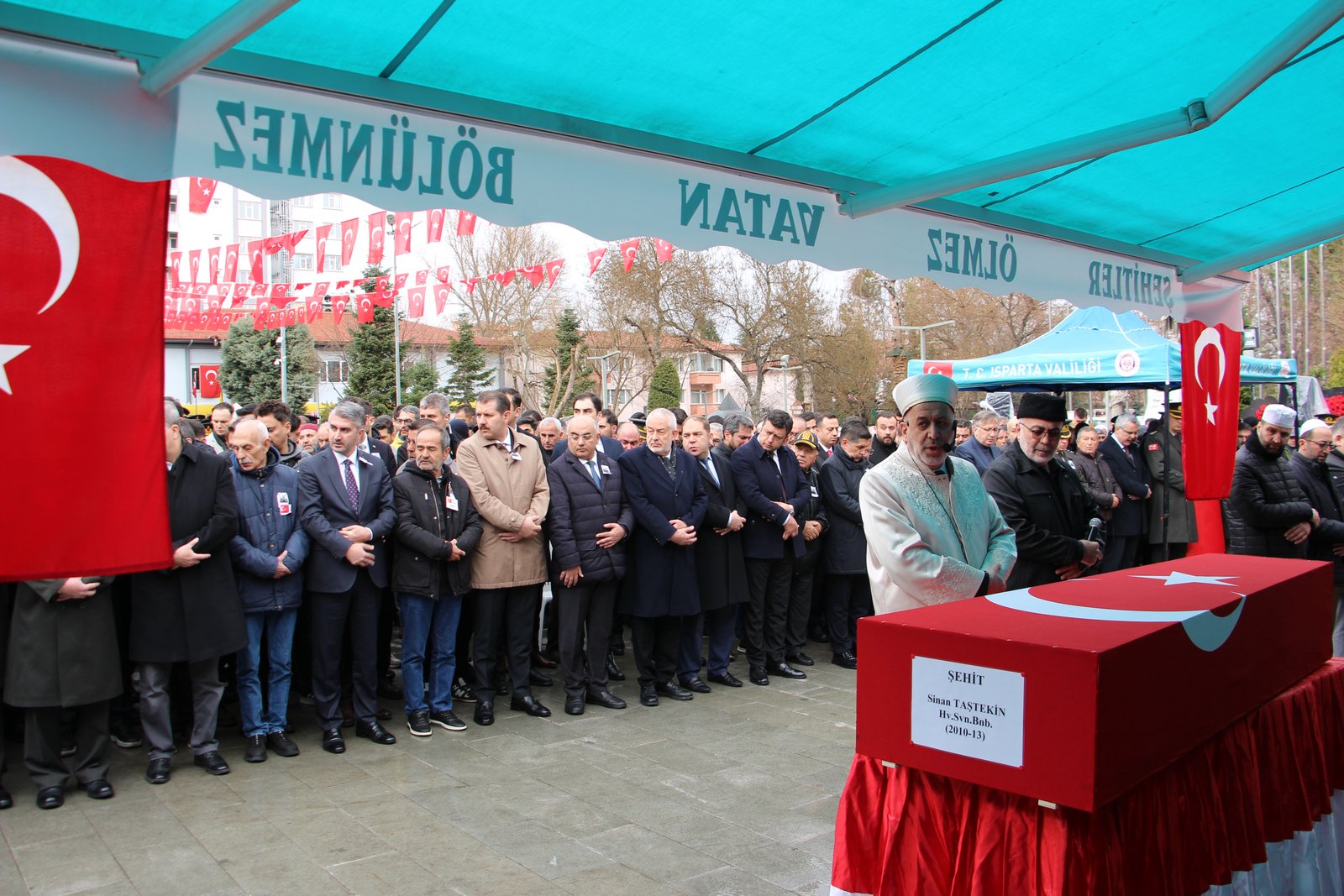 Katar- Türk Birleşik Müşterek Kuvvet Komutanlığı bünyesinde eğitim faaliyeti yürüten helikopterin kaza kırıma uğraması sonucu şehit olan Hava Savunma Binbaşı Sinan Taştekin için Isparta’da ikindi namazının ardından cenaze töreni düzenlendi. 15 Temmuz Cumhuriyet ve Demokrasi Meydanı’nda düzenlenen törene Milli Savunma Bakan Yardımcısı Salih Ayhan, Aile ve Sosyal Hizmetler Bakan Yardımcısı Zafer Tarıkdaroğlu, Isparta Vali Vekili Hamdullah Suphi Özgödek, milletvekilleri Osman Zabun, Mehmet Uğur Gökgöz, Yalım Halıcı, Belediye Başkanı Şükrü Başdeğirmen, siyasi parti il başkanları, sivil toplum kuruluşlarının temsilcileri ve çok sayıda vatandaş katıldı. Cenaze namazı öncesi eşi Nergis Taştekin ve kız kardeşi İmran Taştekin, şehidin tabutuna sarılıp, ağladı. Daha sonra tabutun başına gelen anne Sezen Taştekin, “Al bayraklı oğlum benim. Sen benim her şeyimsin, annem. Gurur kaynağım benim. Canım oğlum benim. Can parçam benim, annem” diyerek gözyaşı döktü. Şehidin babası Ali Taştekin de tören sırasında güçlükle ayakta durabildi.