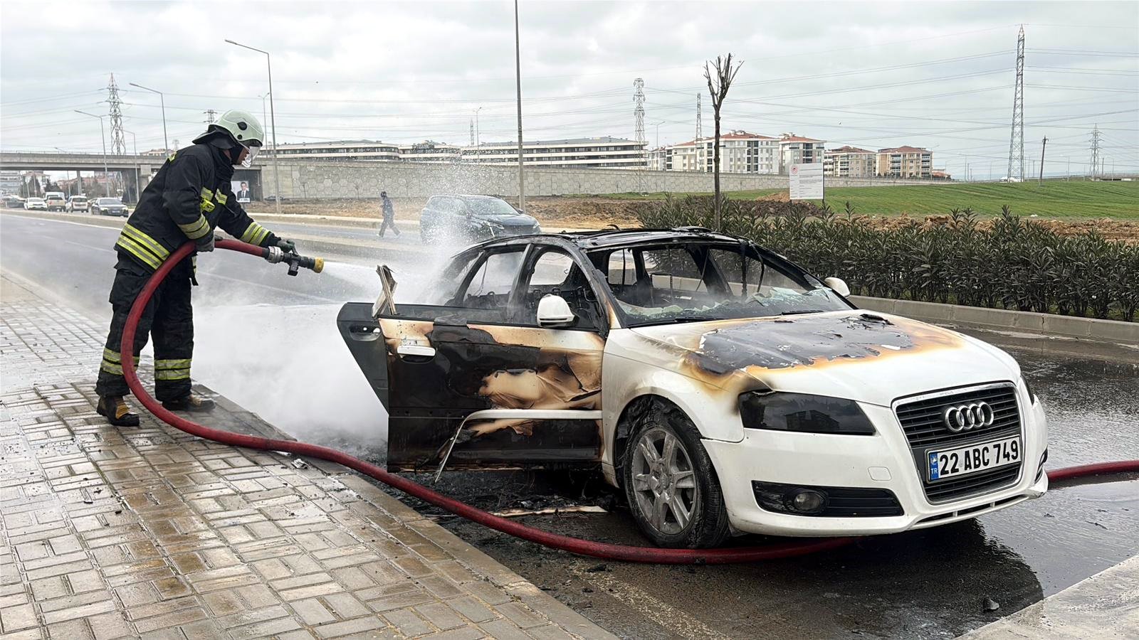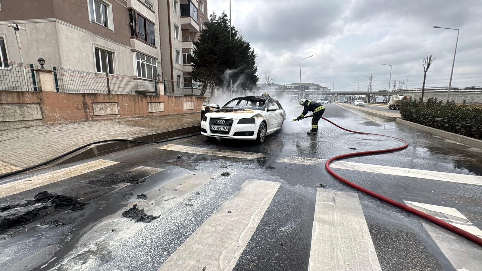 Olay, Nusratiye Mahallesi Kurtuluş Caddesi’nde meydana geldi. N.Ö. idaresindeki 22 ABC 749 plakalı otomobilden, seyir sırasında duman yükselmeye başladı. Durumu fark eden sürücü, aracı yol ortasında durdurarak kendini dışarı attı. Bir anda alevler büyürken, ihbarla bölgeye itfaiye, sağlık ve polis ekipleri sevk edildi. Ekiplerin müdahalesiyle yangın söndürülürken, otomobil kullanılamaz hale geldi. Yangının çıkış nedenine ilişkin inceleme başlatıldı. (DHA)