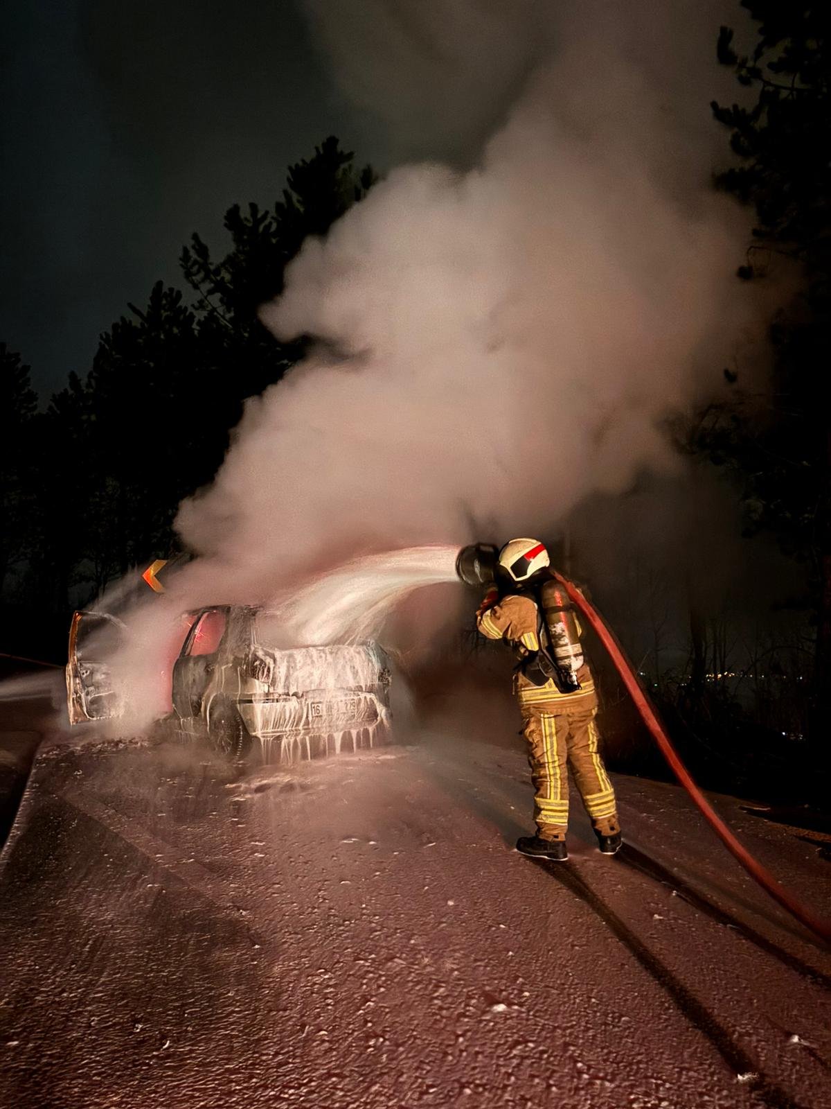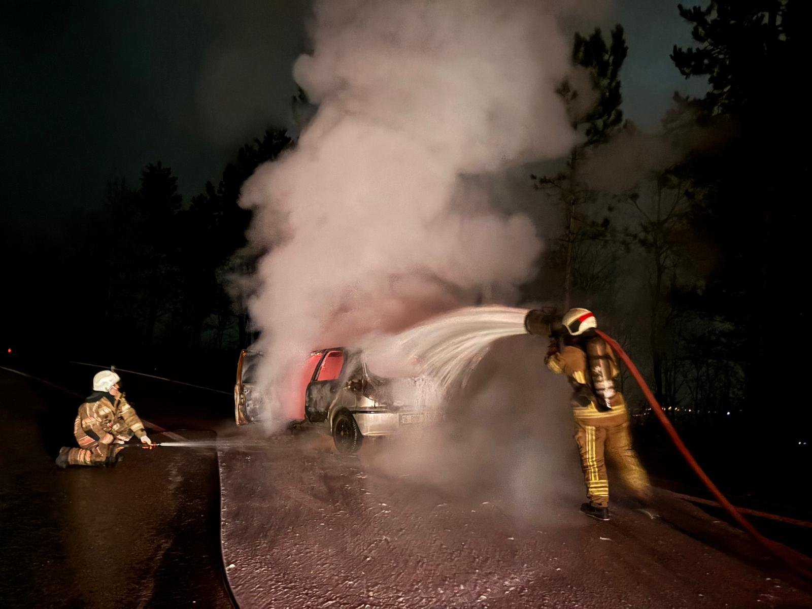 Saat 05.00 sıralarında kırsal Cerrah Mahallesi’nden Çiftlik Mahallesi’ne 16 BZN 229 plakalı otomobiliyle seyir halinde olan Enes Y., motor kısmından duman çıktığını fark edince aracı yol kenarına park edip itfaiyeye haber verdi. İhbarla olay yerine gelen itfaiye ekipleri, alevleri kısa sürede kontrol altına alıp söndürürken, otomobil kullanılamaz hale geldi. (DHA)