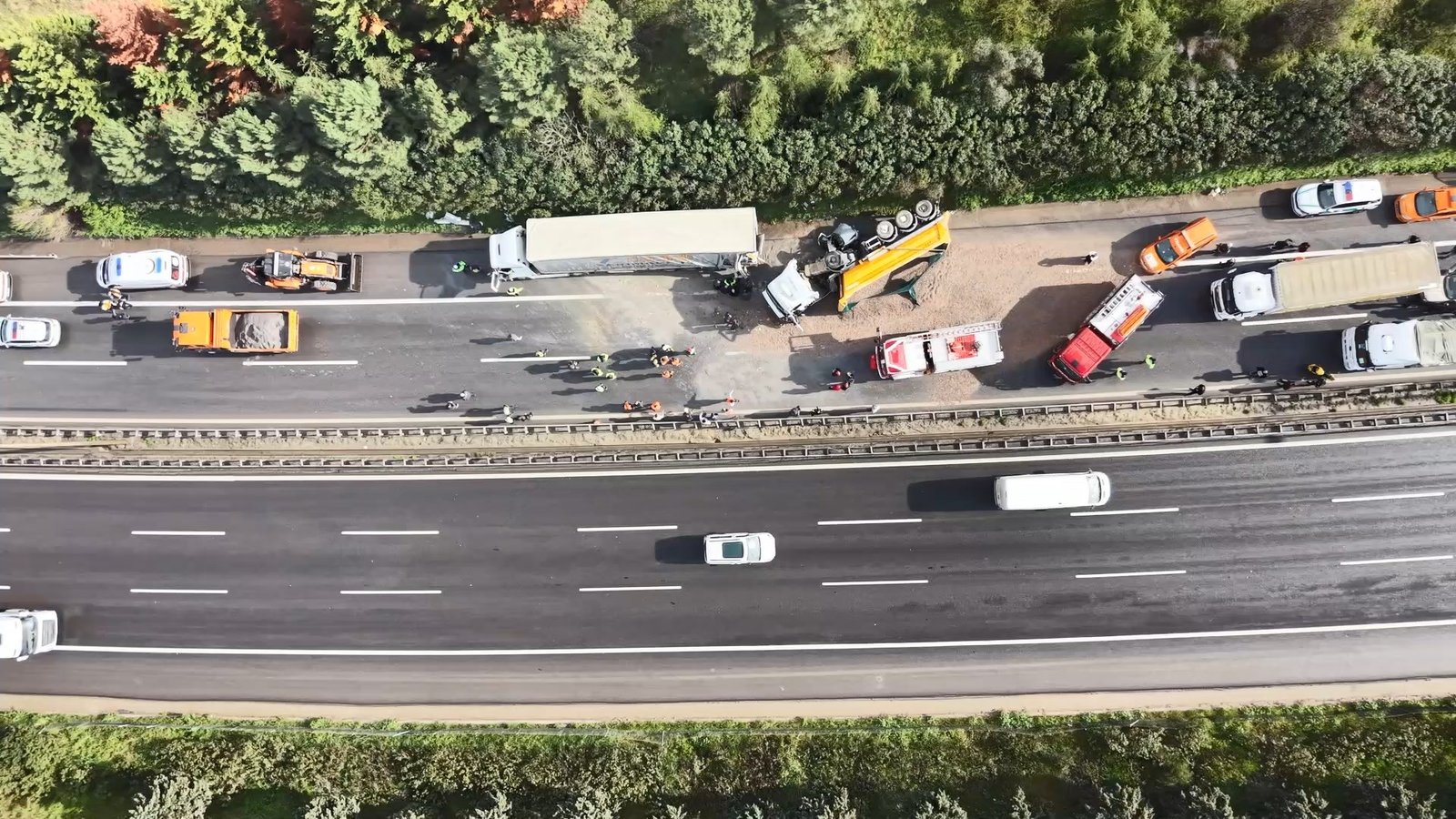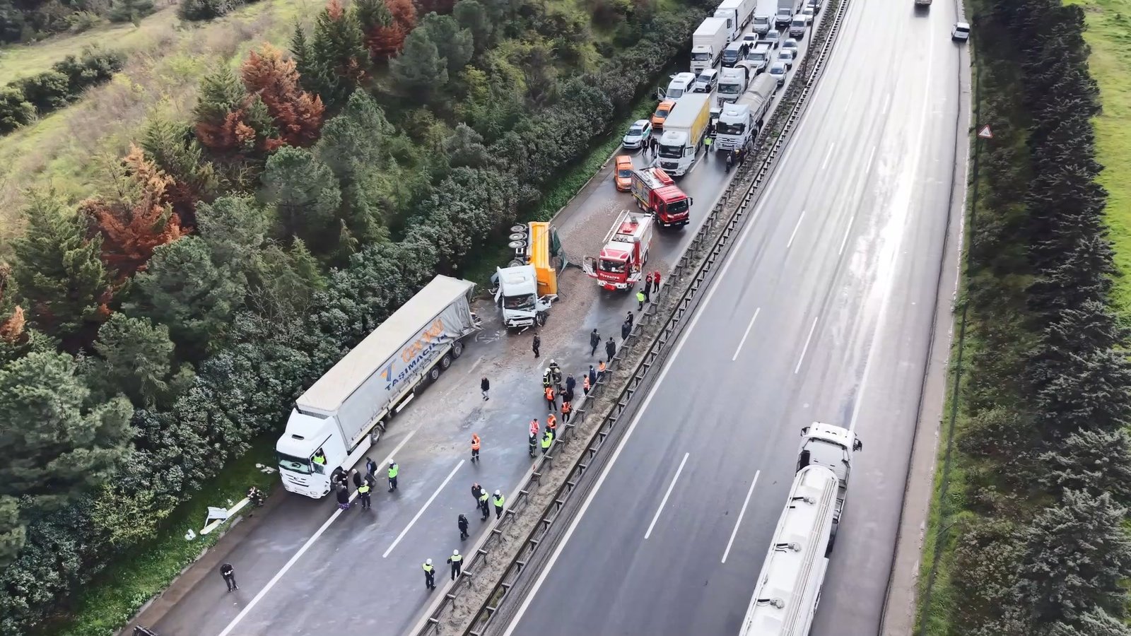 Kaza nedeniyle TEM Otoyolu’nun Ankara yönü ulaşıma kapanırken, bölgede kilometrelerce araç kuyruğu oluştu. Jandarma ekipleri, sürücüleri Kuruçeşme (Batı) TEM gişelerinden D-100 kara yoluna yönlendirdi. Ekiplerin yolu yeniden ulaşıma açmak için çalışmaları sürüyor. (DHA)