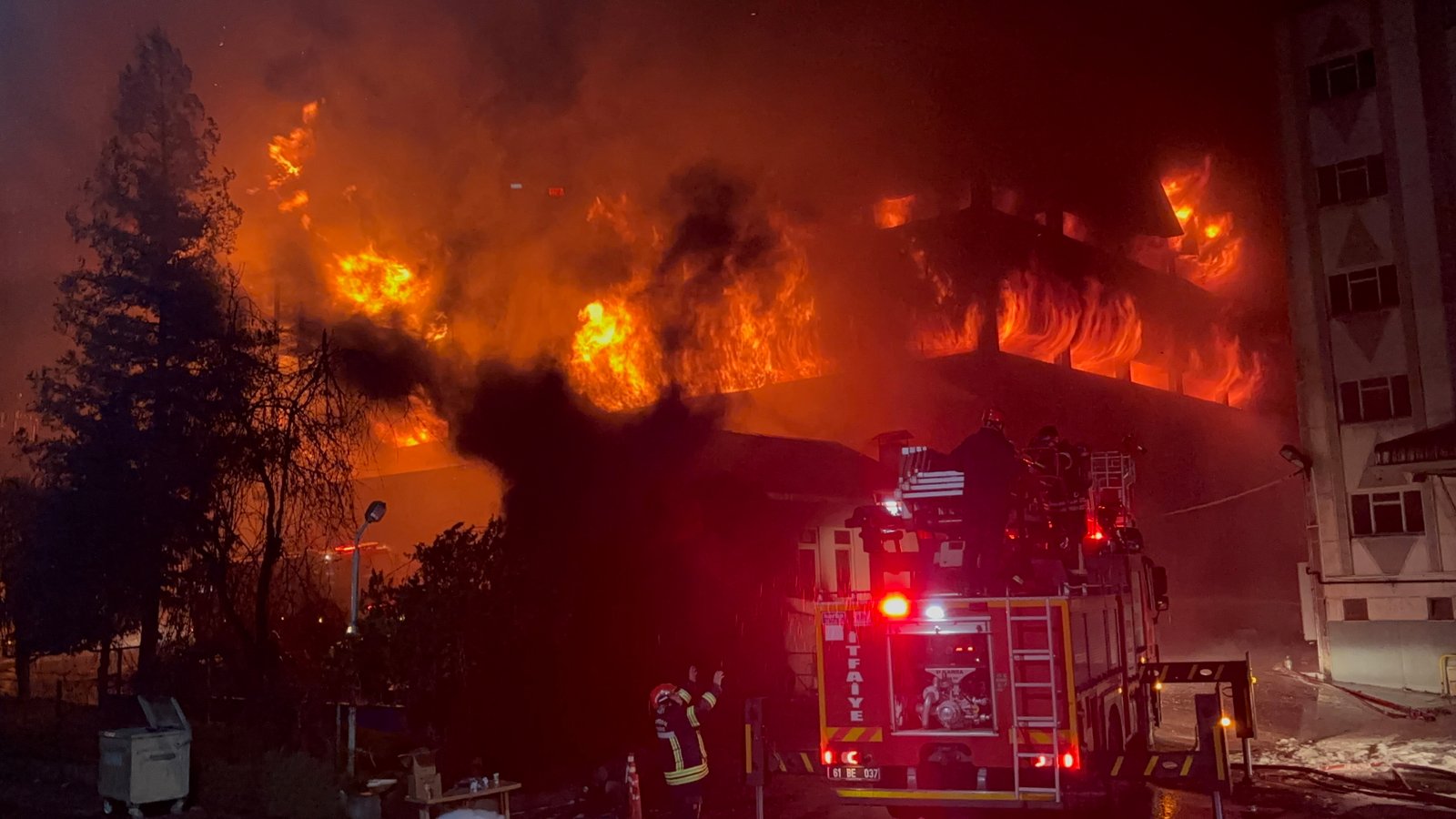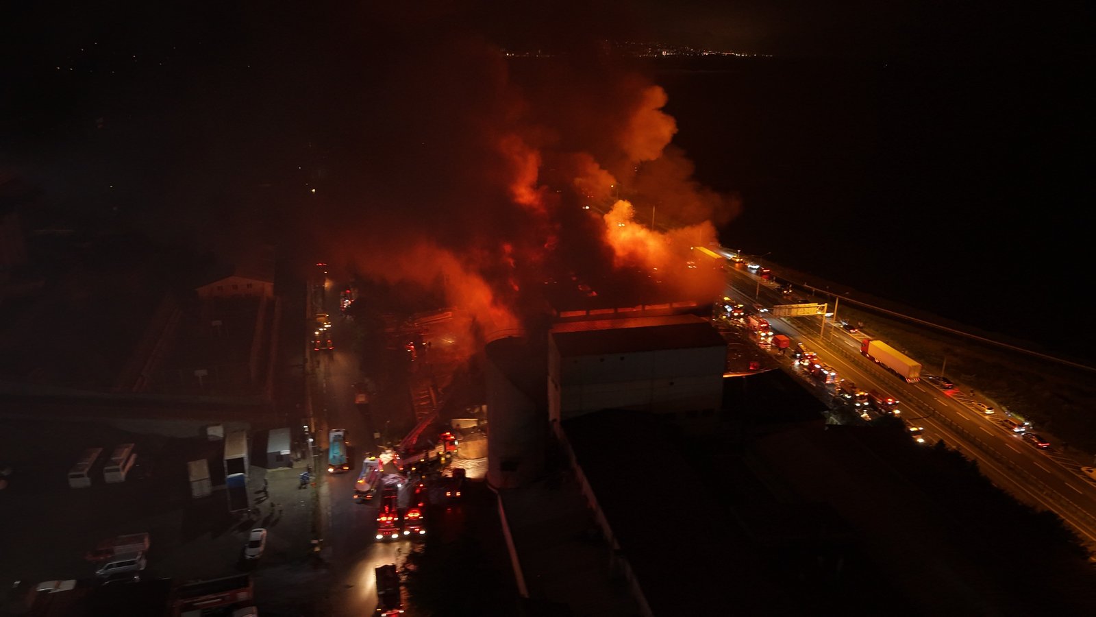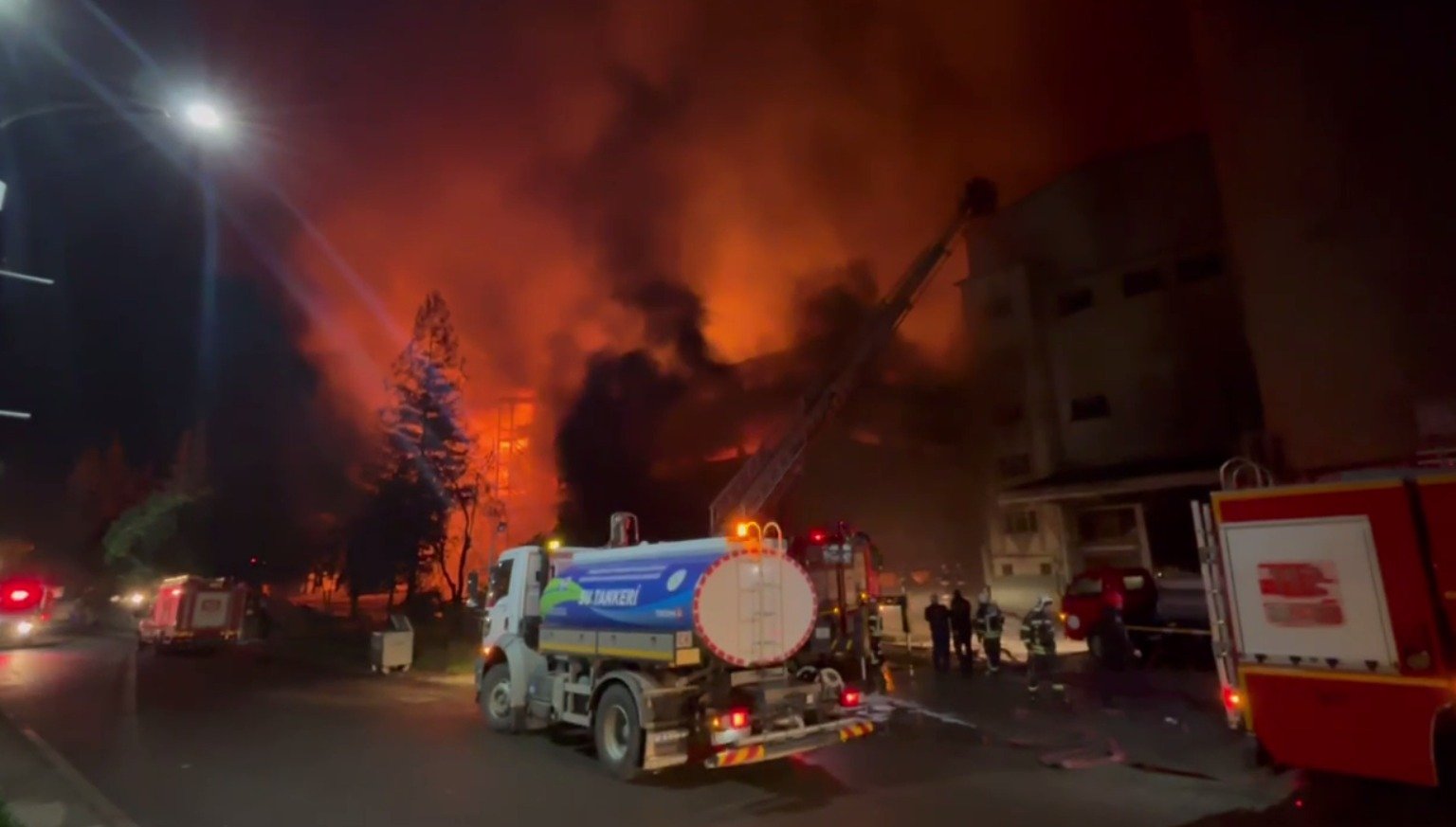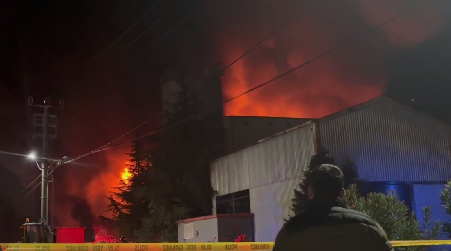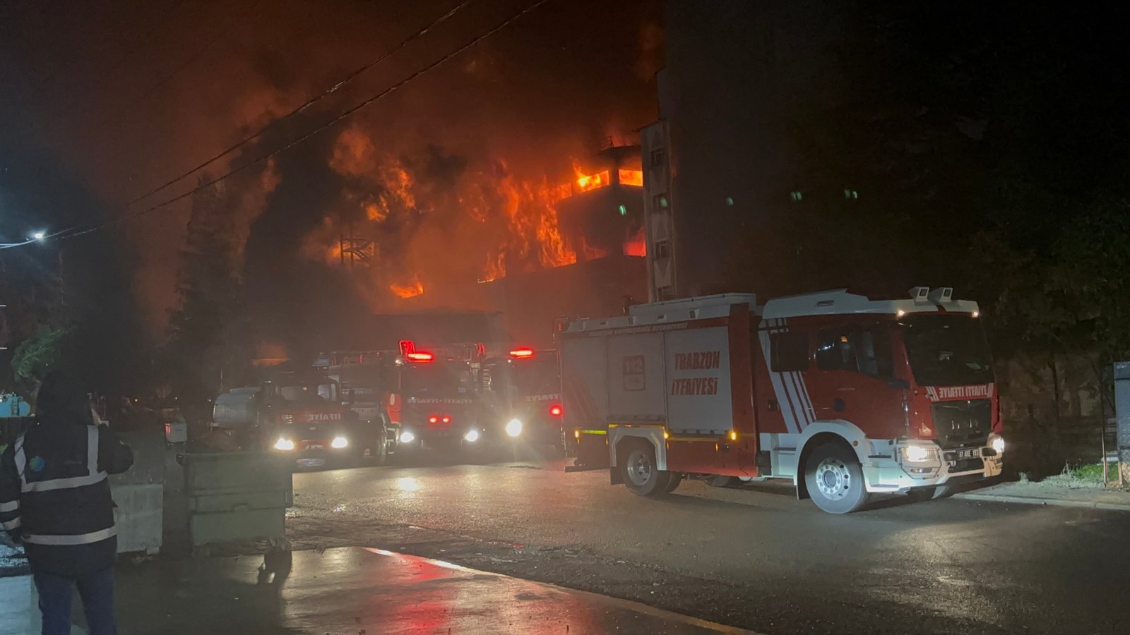 Trabzon’un Arsin Organize Sanayi Bölgesi’nde faaliyet gösteren bir fındık fabrikasında çıkan yangın, ekiplerin yoğun müdahalesine rağmen soğutma çalışmaları sırasında yeniden alevlendi. Kısa sürede büyüyen yangın, fabrikanın büyük bölümünü sararken, bölgeye çok sayıda itfaiye ekibi takviye gönderildi. Yangının kontrol altına alınması için çalışmalar aralıksız sürdürülürken, ekipler alevlerin çevredeki diğer tesislere sıçramaması için yoğun çaba harcıyor. Zaman zaman etkisini artıran yangın nedeniyle fabrikanın çevresinde geniş güvenlik önlemleri alındı. Yangının alevlendiği anları ve ekiplerin müdahalesi dronla görüntülendi. (DHA)