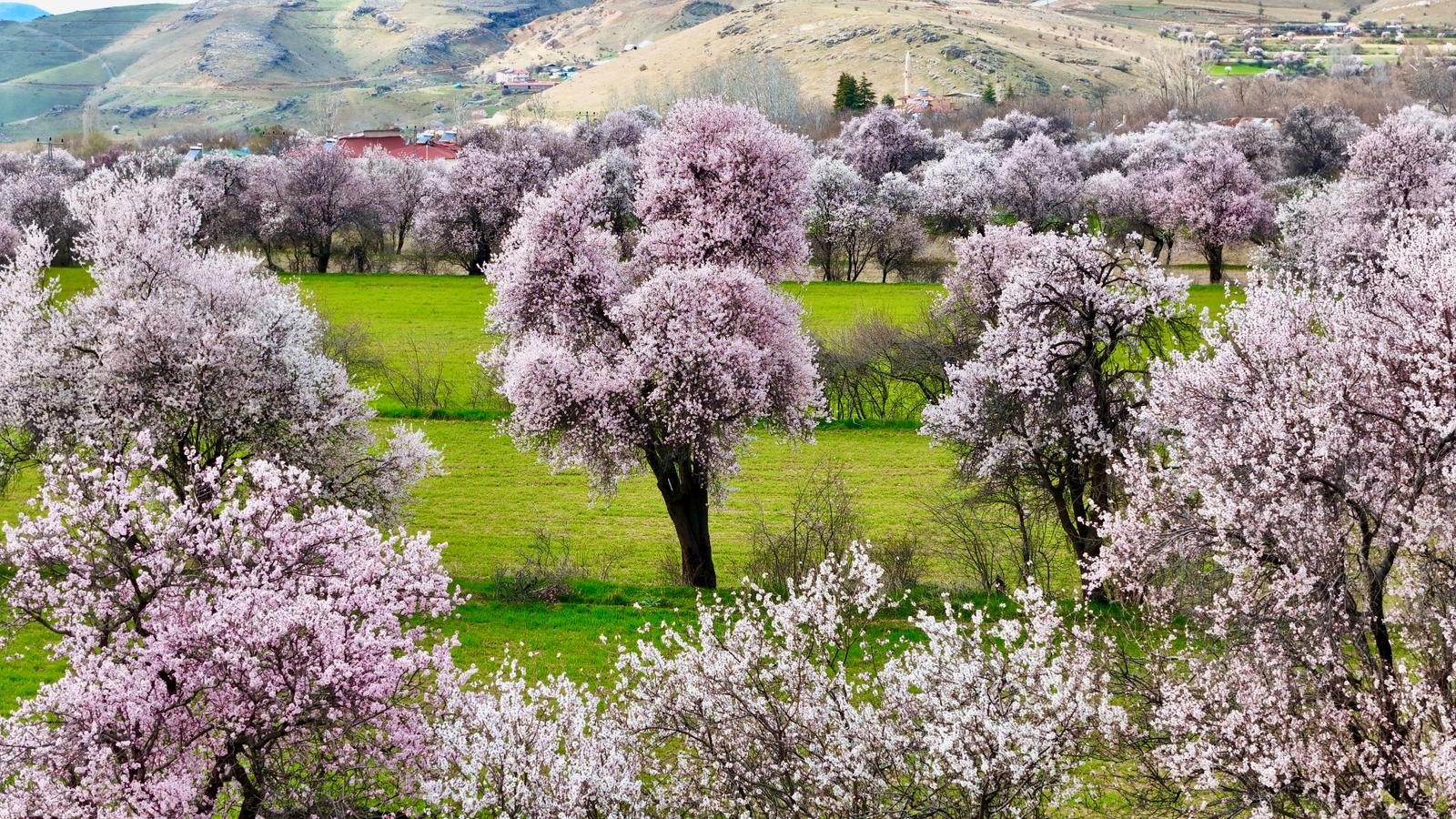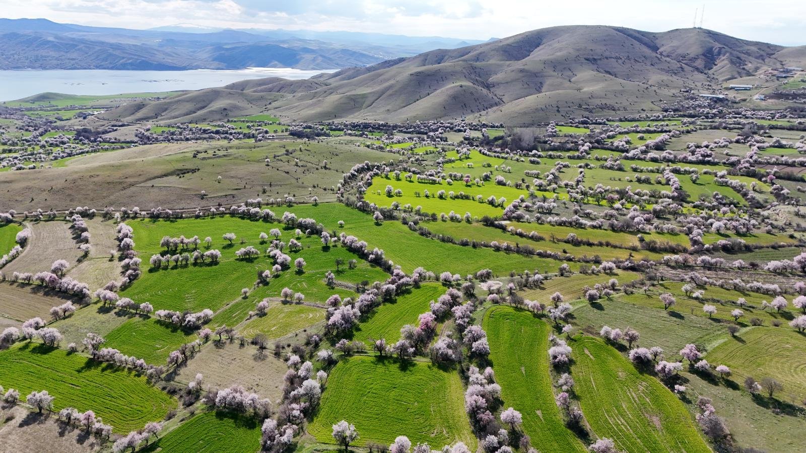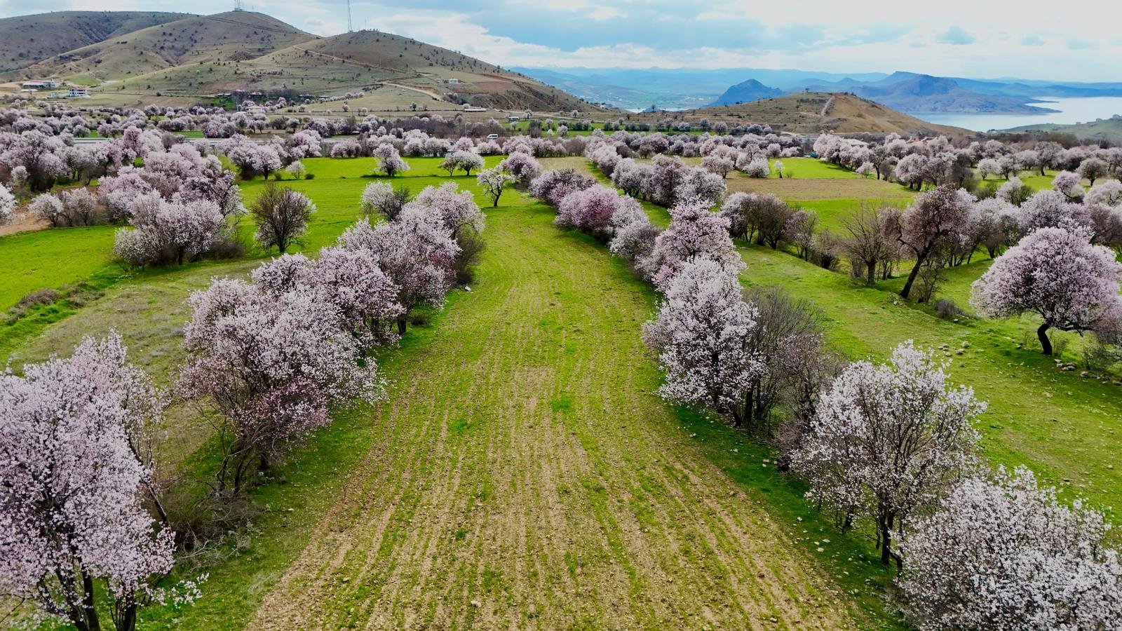 Serhat Ozan YILDIRIM/PERTEK (Tunceli), (DHA)-TUNCELİ’nin Pertek ilçesinde hava sıcaklıklarının artmasıyla badem ağaçları çiçek açtı. Beyaz ve pembe tonlara bürünen ağaçların oluşturduğu manzara, dron ile havadan görüntülendi.