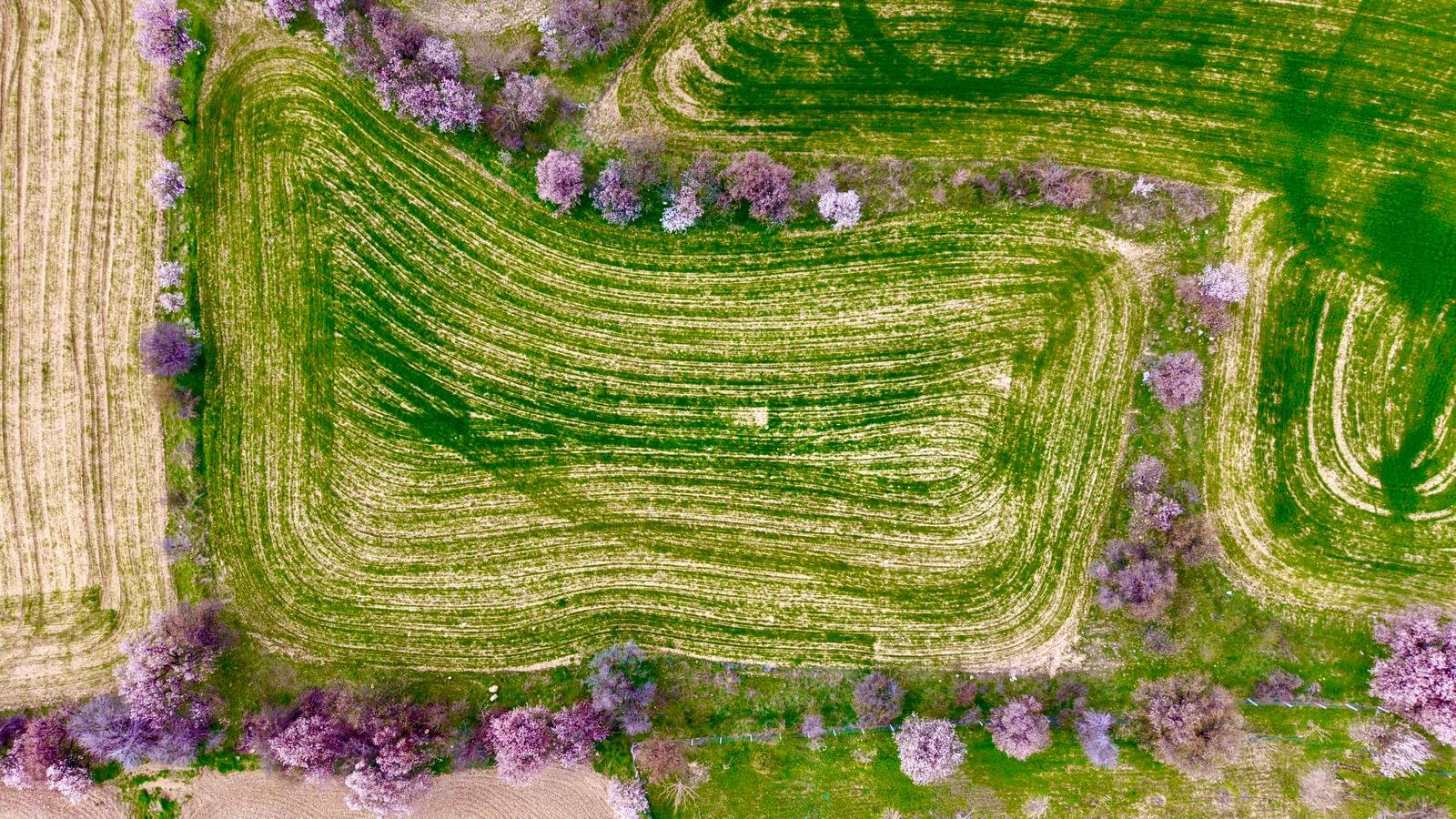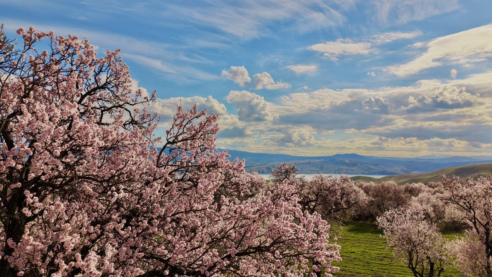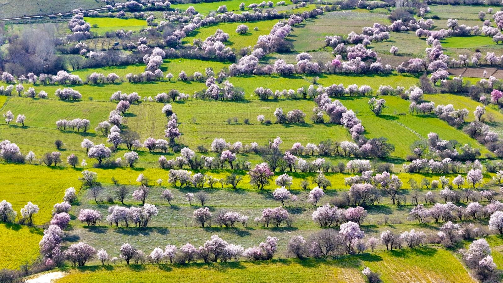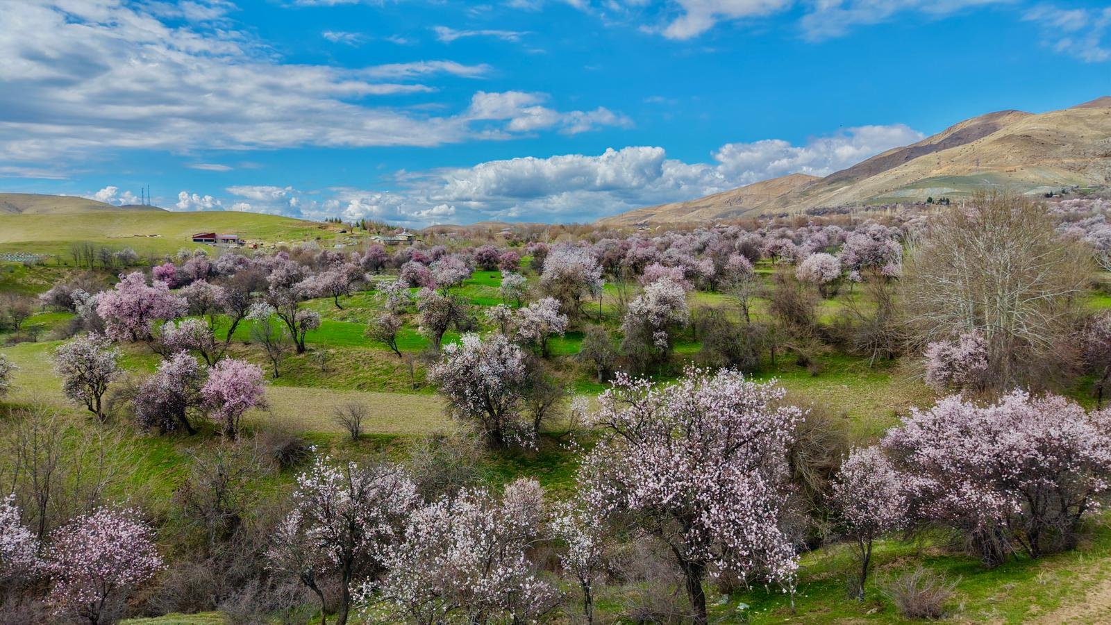 Serhat Ozan YILDIRIM/PERTEK (Tunceli), (DHA)-TUNCELİ’nin Pertek ilçesinde hava sıcaklıklarının artmasıyla badem ağaçları çiçek açtı. Beyaz ve pembe tonlara bürünen ağaçların oluşturduğu manzara, dron ile havadan görüntülendi.