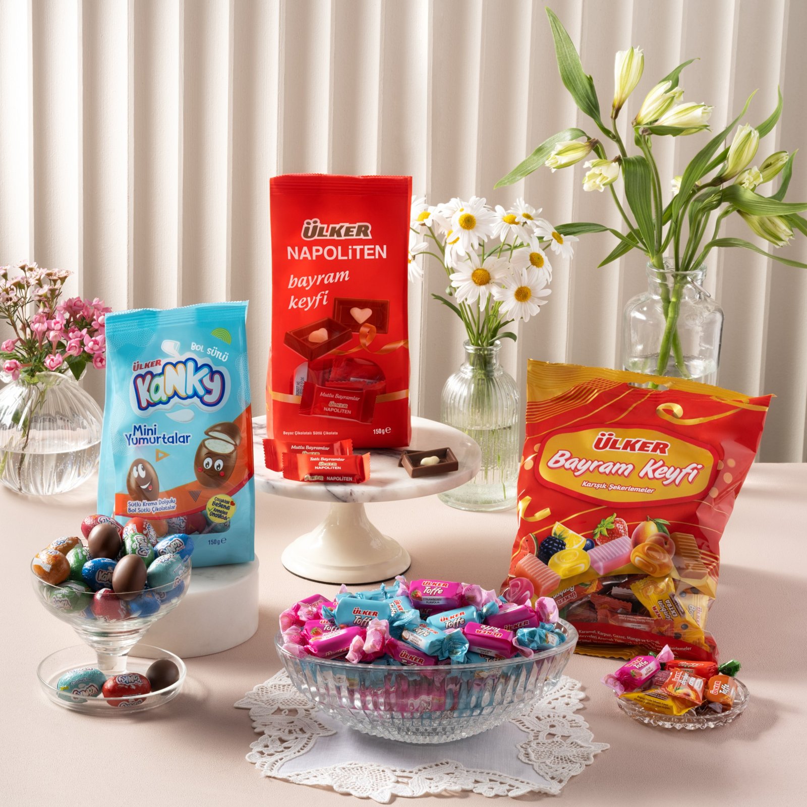 “Ülker’in bayram denildiğinde akla ilk gelen ürünlerinden bütün fındık ve fındık kremalı “Ece”, bütün Antep fıstığının sütlü çikolatayla buluştuğu Çıtır Kadayıflı Ece ve bitter kremalı, bütün fındıklı, beyaz çikolatalı Ece Trio toplam üç farklı çeşidiyle bayram buluşmalarına tat katacak. Sevilen napoliten lezzeti Ülker Napoliten Bayram Keyfi, bayrama özel mesajlarıyla şekerliklerde yerini alacak. Ülker Kanky Mini Yumurtalar ise bayramda çocukları mutlu edecek.