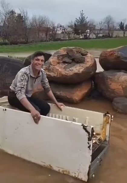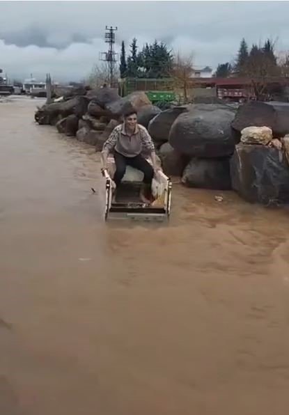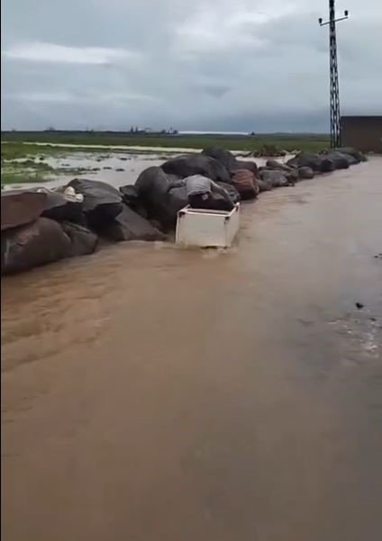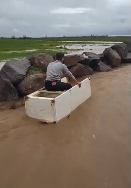 Kentte, 3 gün boyunca etkili olan sağanak yaşamı olumsuz etkiledi. Birçok yerde tarım arazileri ve yollar taşan suyla göle döndü. Kızıltepe ilçesi Kırsal Dikmen Mahallesi’nde de yola dolan suyu eğlenceye çeviren bir kişi, hurda buzdolabı kasası ile ilerledi. O anlar cep telefonu kamerasıyla görüntülendi. Sanal medyada paylaşılan görüntüler beğeni topladı. (DHA)